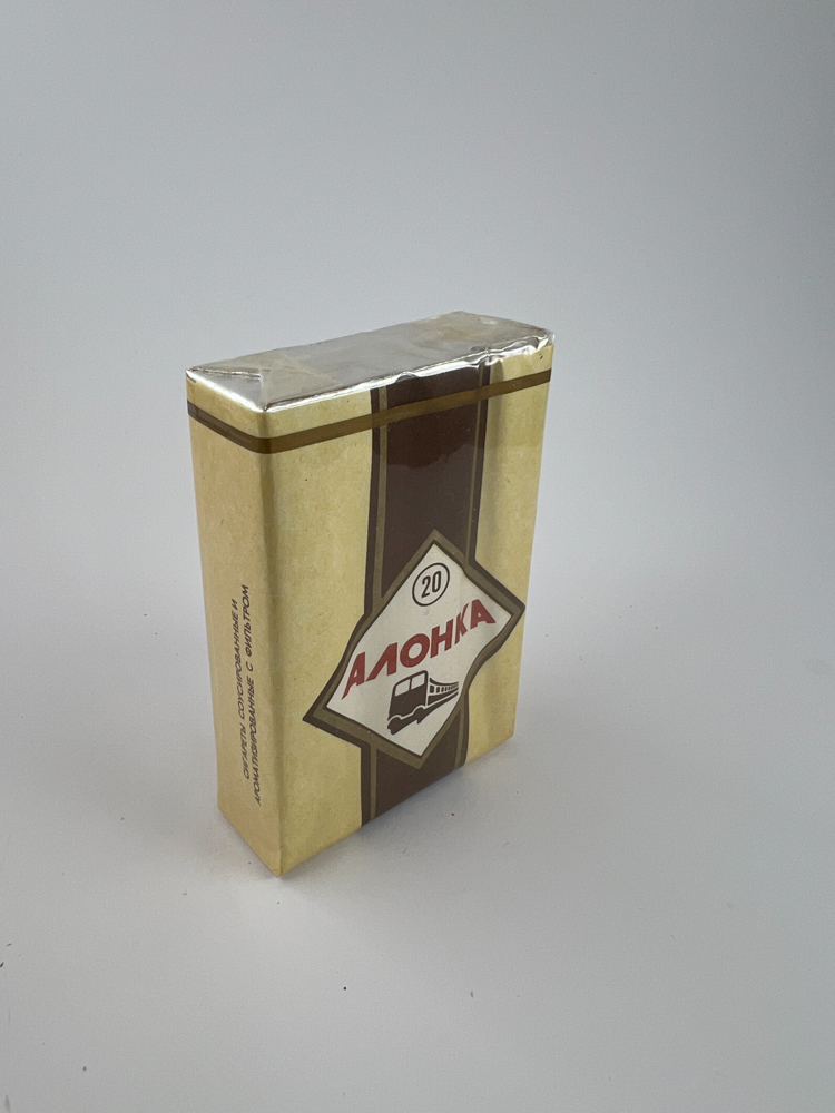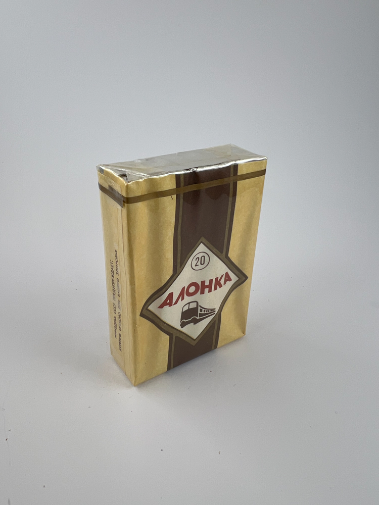 „АЛОНКА“ is a Soviet cigarette brand dedicated to the theme of transport and railways, as evidenced by the train depicted in the logo. The packaging is beige and brown, with a geometric background, and in the center is a diamond-shaped logo, which contains the name and symbols of transport. Visually, the package is minimalist, but clearly conveys the thematic orientation towards the working class or specific consumer segments. The inscriptions indicate that these are flavored cigarettes with a filter. The packaging is intact, with the original film.
