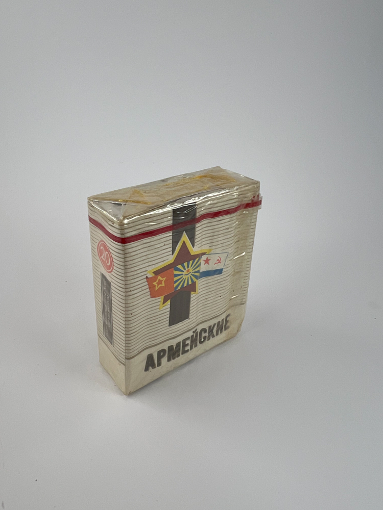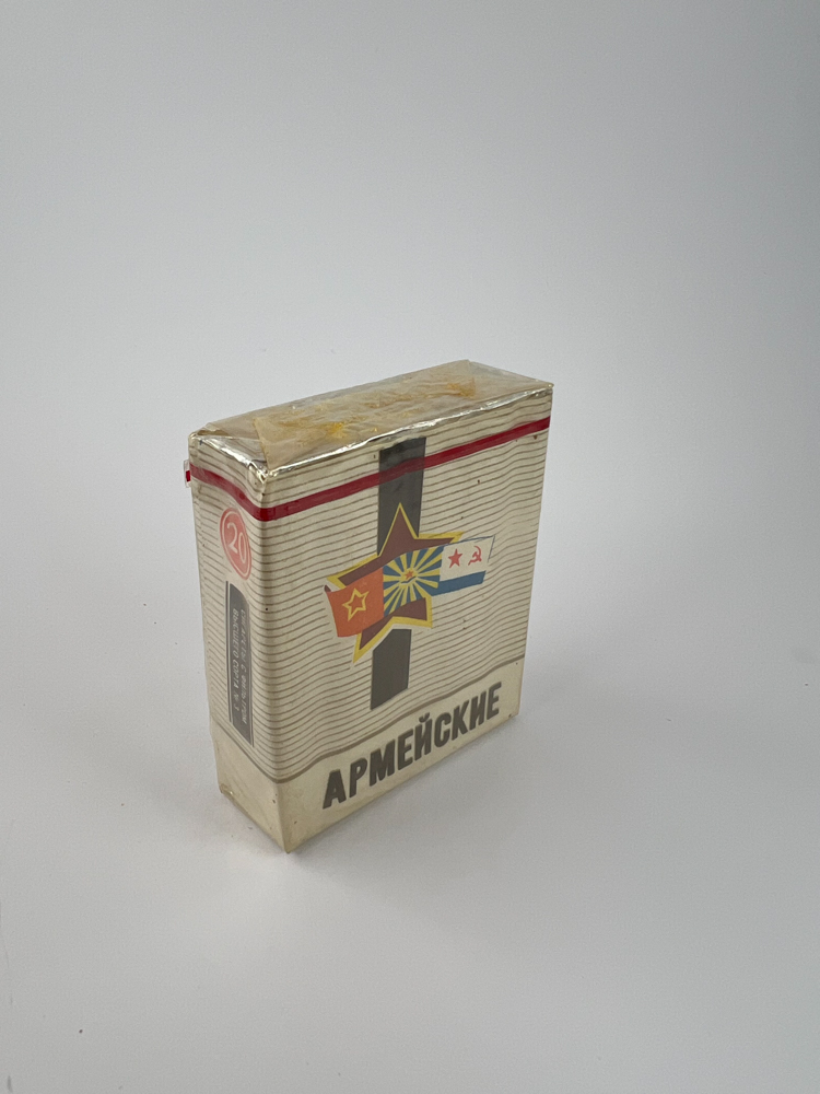 Description: „The “Army„ cigarette pack is an exclusive military-themed edition of the USSR period. In the center of the design is a stylized five-pointed star with motifs of the flags of several Soviet naval and land forces, symbolizing the army. The background is light with wavy lines that create a dynamic impression. The sides indicate that the pack contains 20 units. The name “Army„ literally means “Military”, so this edition was intended either for the military forces, or as a stylized product for the market, promoting patriotism.