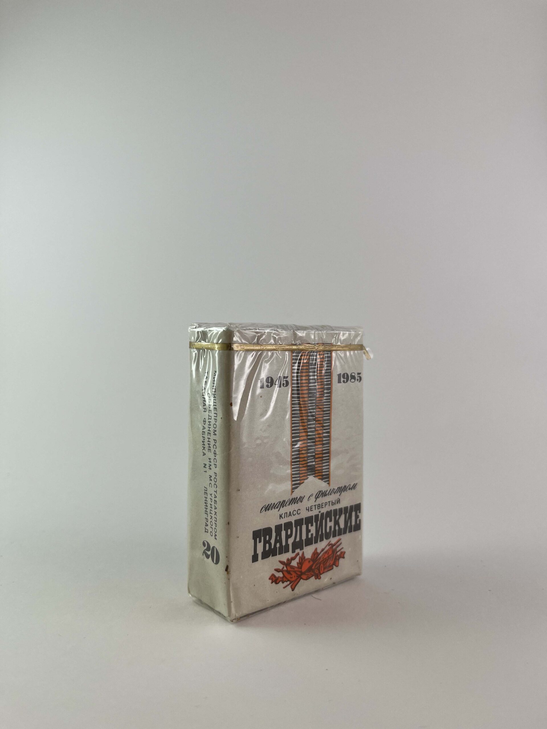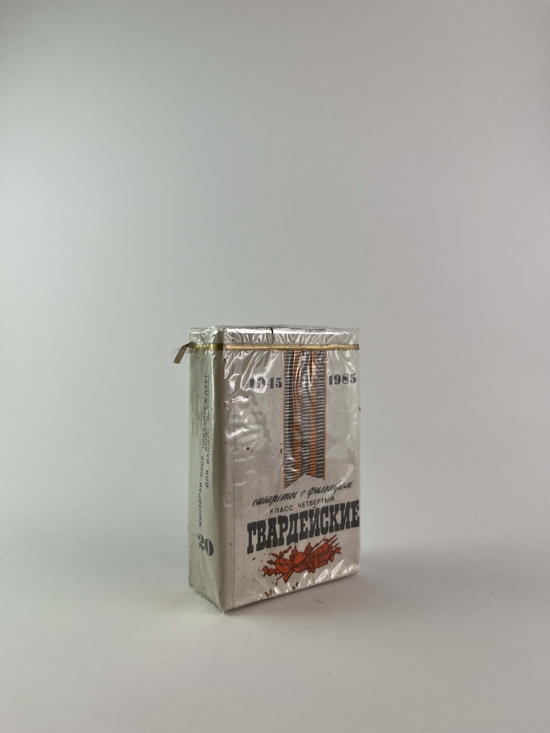 Description: Гвардейские (1945-1985) cigarette pack is designed to commemorate the 40th anniversary of the end of World War II. The design symbolizes military honor and Soviet symbolism - the St. George ribbon and the laureate wreath are visible on the pack. The white background highlights patriotic elements, and the red and orange motifs add brightness. This pack reflects the features of the USSR propaganda design and the spirit of the times.