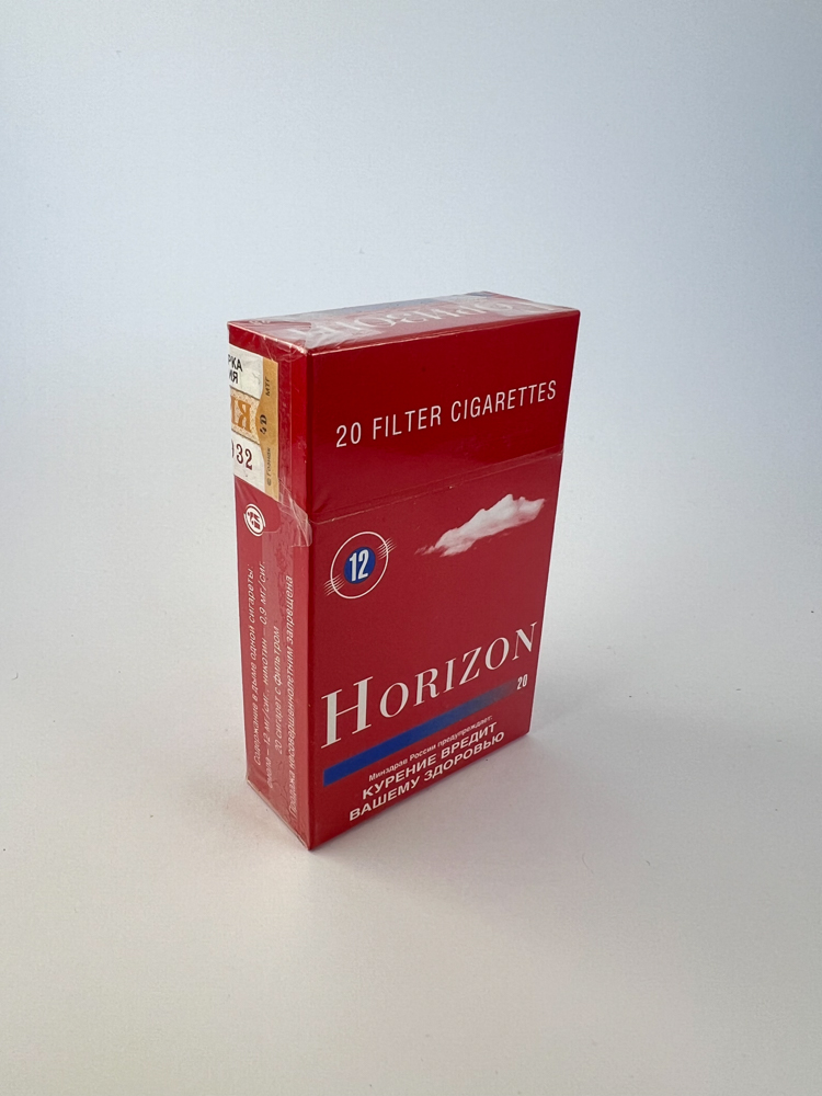 Description: „Horizon 12 is a red, hard pack of cigarettes intended for the Russian market. On one side, the name is presented in Russian (Горизонт) and on the other side, in Latin letters (Horizon), thus maintaining a bilingual design. The original Russian excise sticker with the serial number is visible at the top, and the pack design is minimalist, with an illustration of a cloud and the number "12" indicating the possible tar content. Warnings about the harms of smoking are presented in Russian, and the pack is intact and tightly closed.