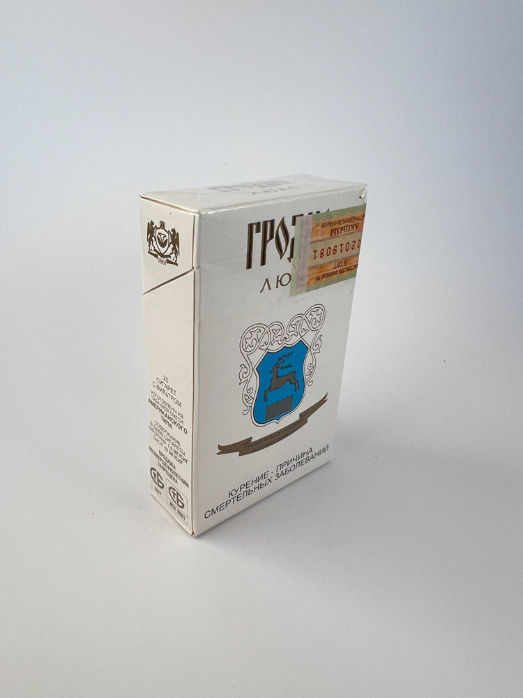 Description: This pack of Grodno Lux cigarettes features a minimalist and clean white design with black lettering and a central blue emblem depicting a galloping deer - the emblem of the city of Grodno. Above the emblem is the word "Люкс", indicating a slightly higher quality than the standard edition. Below is a warning about the harms of smoking in Russian. On the side of the pack is the inscription: "20 сигарет с фильтром класса А", and on top is a Belarusian excise sticker confirming the authenticity of the product.