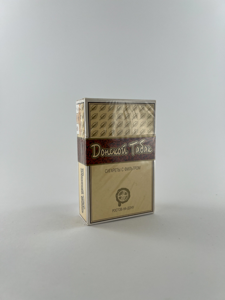 This pack of Donskoy Tabak cigarettes is one of the classic examples of the Russian tobacco industry, produced in Rostov-on-Don. The design of the pack is kept conservative - a background of warm cream tones, a tobacco leaf motif at the top and handwritten text on the back, conveying the impression of "individuality". These are regular-strength cigarettes with a filter. The original Russian excise stamp, confirming legal circulation in the domestic market, is clearly visible on the pack.