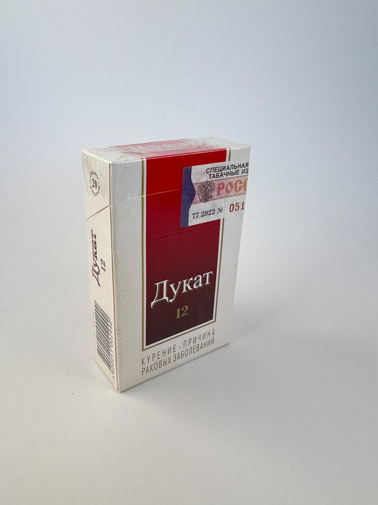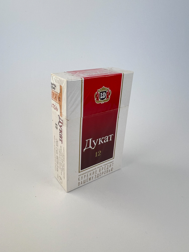 Description: „"Dukat 12" is one of the classic products of the Russian tobacco industry, characterized by a simple but solid design. The combination of red and white colors, gold-plated edges and the central LD logo give the pack an official and traditional image. The resin content is indicated on the front - 12 mg. The pack is in excellent condition, with an original Russian excise stamp, indicating authenticity and the exact period of distribution.