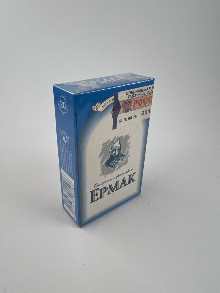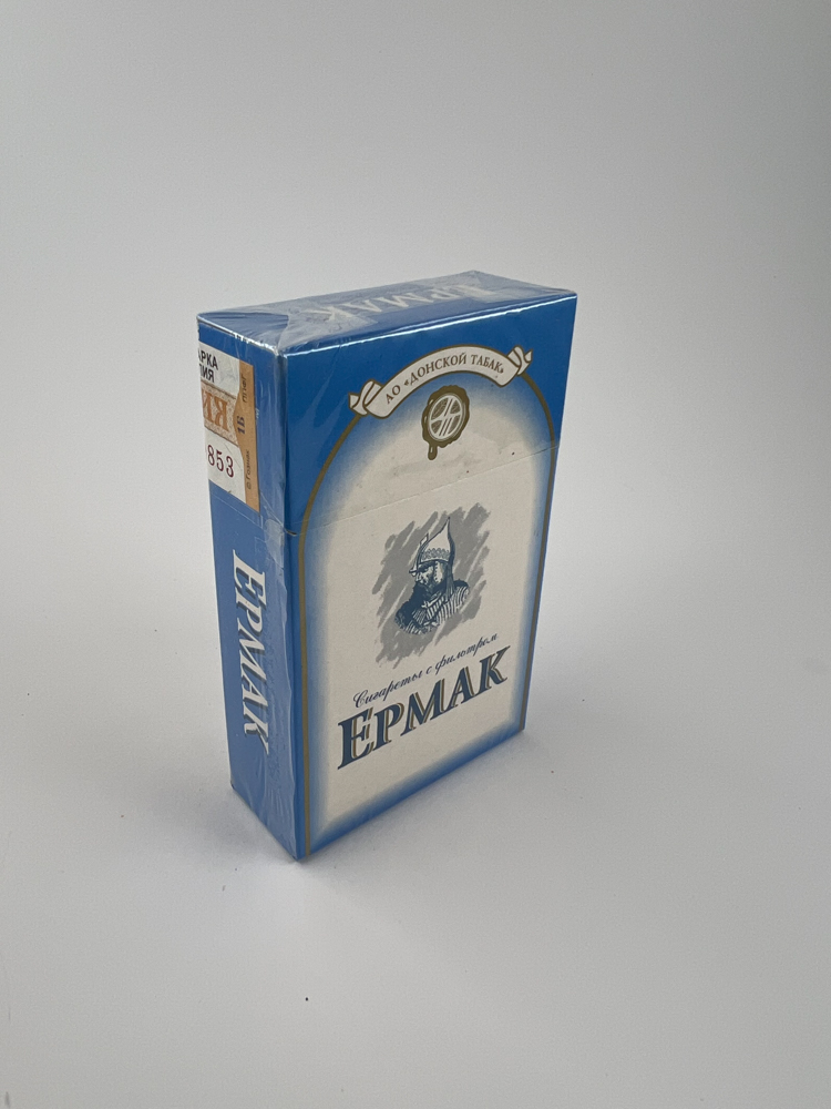 Šis „Ermak“ cigarečių pakelis pasižymi šviesiu, klasikinio stiliaus dizainu su mėlynos ir baltos spalvų deriniu. Centre pavaizduotas istorinės figūros – Jermako, Sibiro užkariautojo – portretas. Virš logotipo – tekstas „АО Донской Табак“, nurodantis gamintoją, o apačioje – užrašas „Сигареты с фильтром“. Vizualiai pakelis išlaikytas tradiciniame stiliuje, siejamas su Rusijos istorija ir patriotine tematika. Šoninėse dalyse pateikta techninė informacija, yra originalus rusiškas akcizo lipdukas. Pakelis neišpakuotas, originalioje plėvelėje.