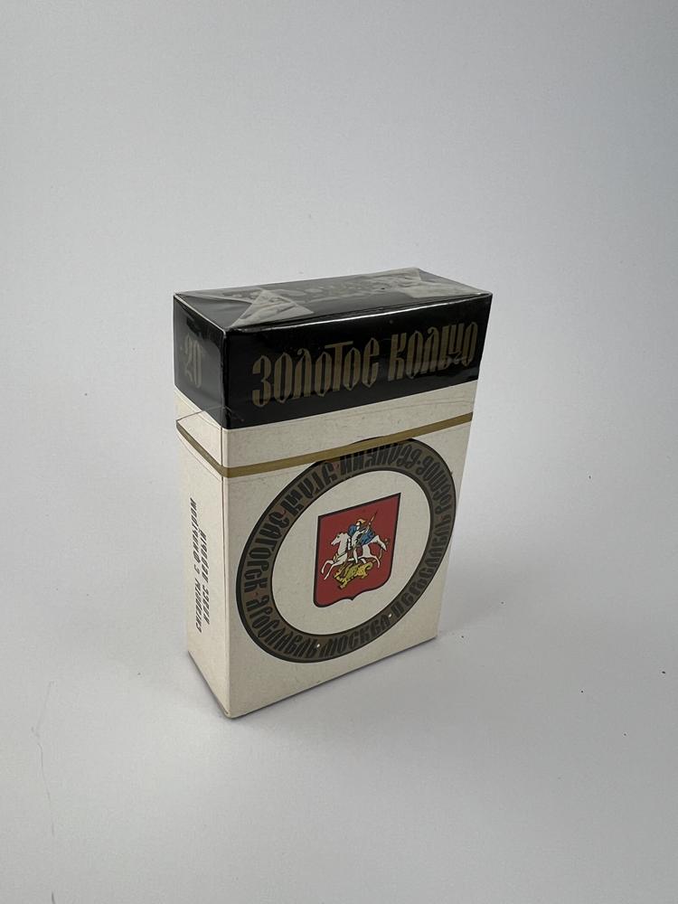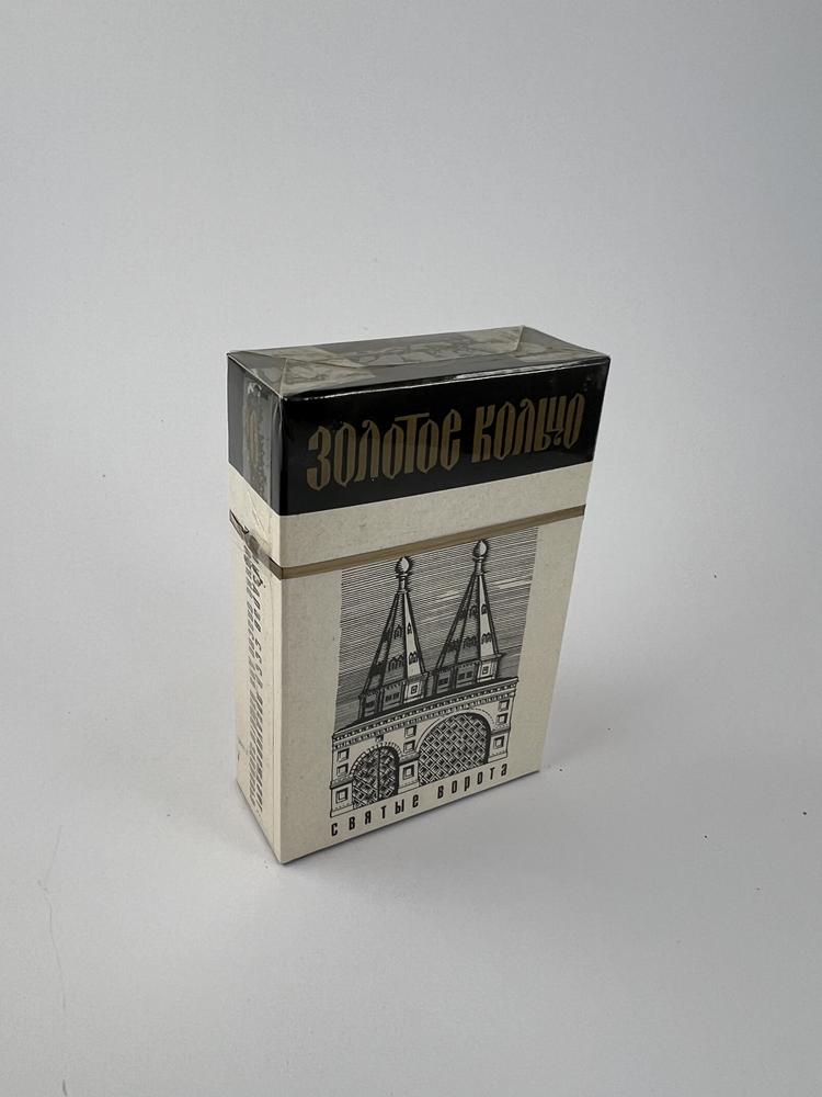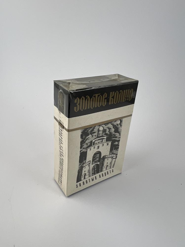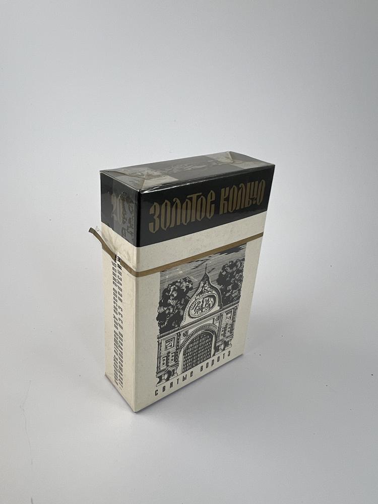 The set is intended for the cities of the „Golden Ring“; each of the 12 packs represents a different city or architectural symbol. The top is black, with an elegant gold inscription „Золотое кольцо“; the bottom is a light body with graphic, linocut-like illustrations (Kremlin towers, St. Gates, sacral architecture) and city coats of arms in circular medallions. The typographic solution is contrasting: a Gothic-style logo at the top and a clear Cyrillic font on the body. The set is presented in an original thematic box with a ring of 12 city coats of arms (natural traces of rubbing are visible), and all packs are unopened, in original cellophane. The overall impression is a solid, representative souvenir edition set, vividly reflecting the aesthetics of late USSR graphics and the theme of tourism.