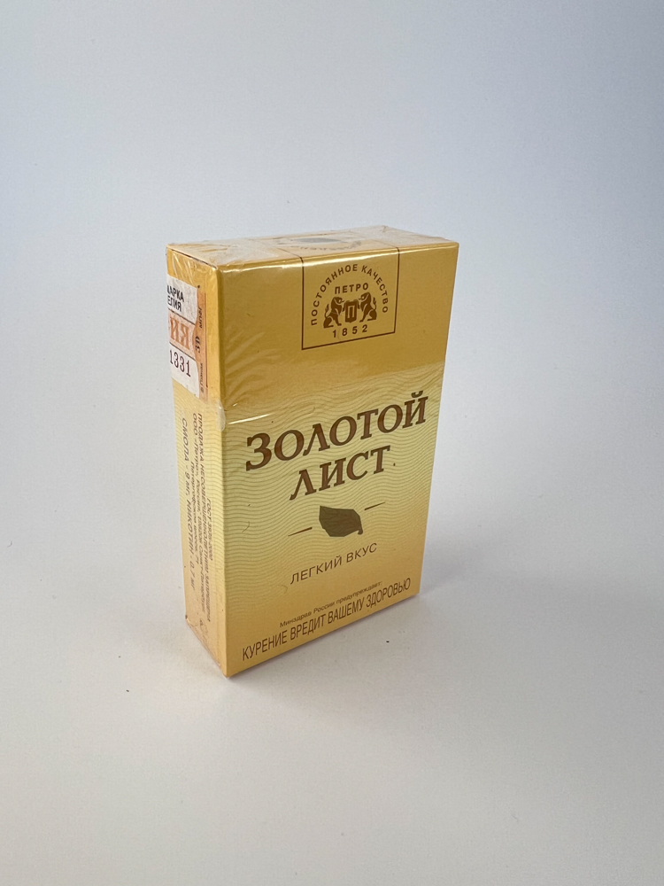 Description: „"Золотой Лист Лёгкий Вкус" is a cigarette pack of a classic Russian design with a yellowish-amber hue, symbolizing naturalness and tobacco leaf. The front side depicts a tobacco leaf and indicates a mild taste ("лёгкий вкус"), and at the top is an antique-style logo with the date "1852", indicating the continuity of tobacco production traditions. The back side contains a detailed description of the manufacturer and production quality accents. The pack has an original film and a Russian excise stamp.