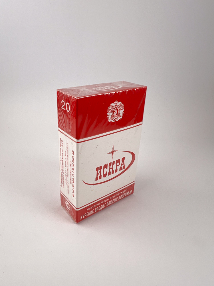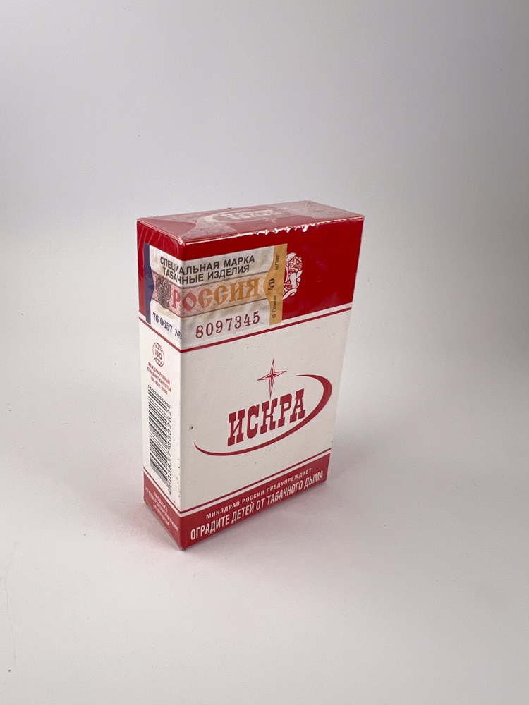 Classic Soviet-style packaging with a minimalist red and white design. The upper part has a red background with the factory emblem, the lower part has a white field with a red logo. „"Iskra"“ (lit. Spark). Among them is a red orbital line and a stylized star, symbolizing both light and progress - a visual reminder of the Soviet aesthetic, common to other tobacco brands that have tried to maintain a traditional image after the 1990s.