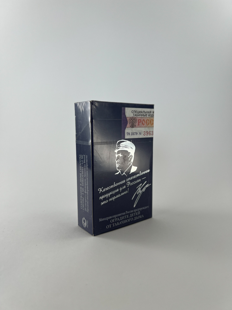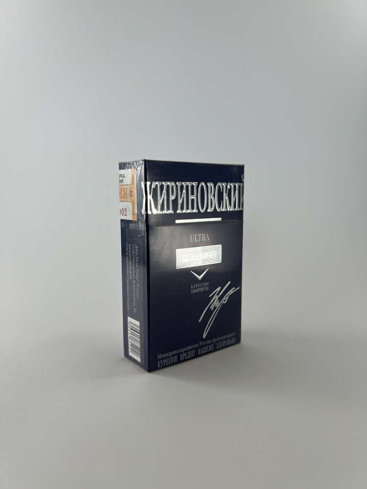 „Кириновский ULTRA“ is a unique, politicized edition of cigarettes, created using the image of Vladimir Zhirinovsky, a prominent Russian politician. The pack features his silhouette, signature and slogan: „Quality products for Russians – this is normal!“. This type of pack was intended for the domestic market as a symbol of patriotic, „national quality“, and is advertised as „Private Blend“ with a special composition. The dark blue design with silver details emphasizes officiality and seriousness.