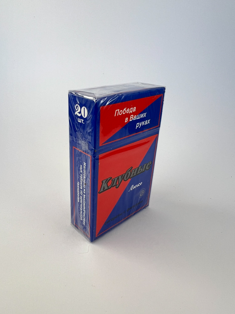 „"Клубные Люкс" (lit. "Club Lux") are classic Russian cigarettes presented in a bright blue and red pack, the design of which is clearly inspired by patriotic motifs. The inscription "Победа в Ваших руках" (lit. "Victory in Your Hands") is visible at the top of the pack, which reflects the motivational tone prevailing at that time. It is noted that the cigarettes are filter-filtered and made from a selected tobacco blend. The pack is sealed and in excellent condition, with the original Russian excise stamp.