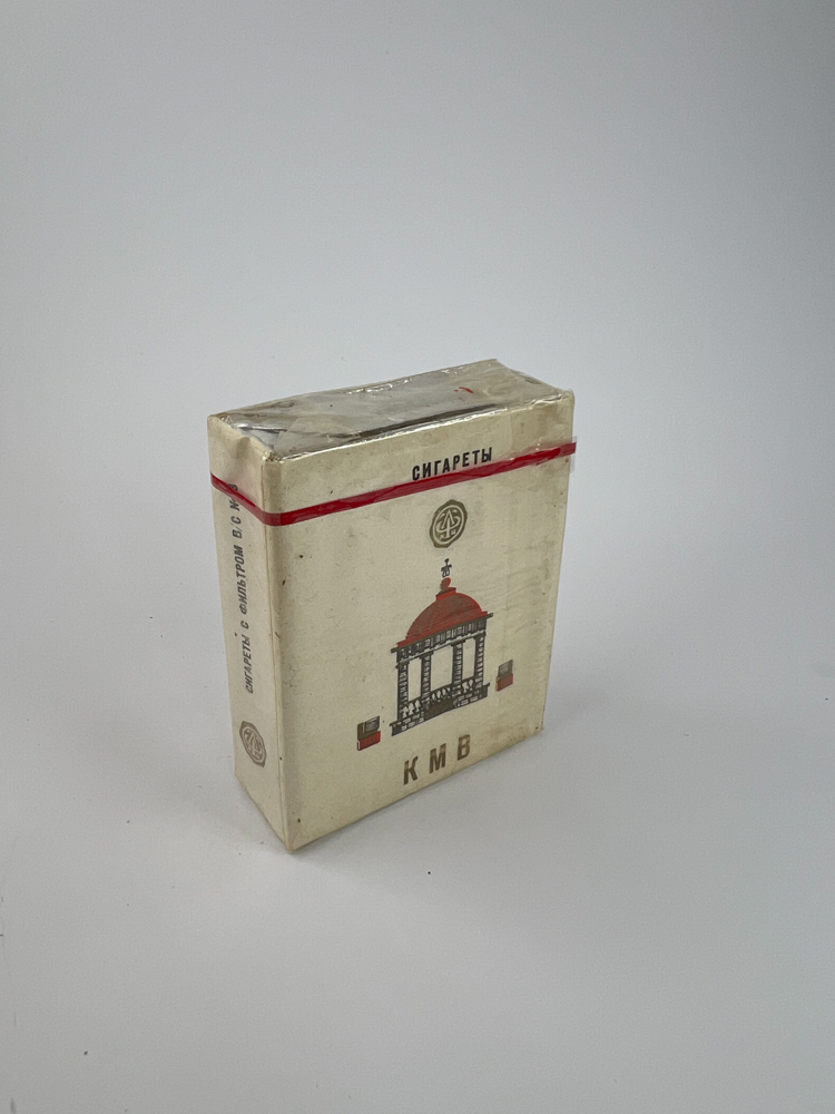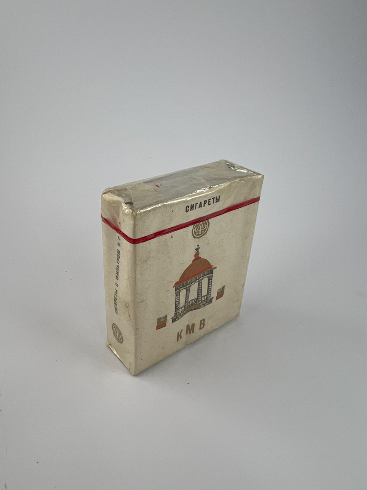 Description: Šis KMV cigarečių pakelis pasižymi minimalistiniu, tačiau autentišku dizainu, kuriame pavaizduotas pastatas su raudonu kupolu – tikėtina, kurorto architektūros motyvas, siejamas su Kaukazo Mineraliniais Vandenimis (Кавказские Минеральные Воды). Pakelis išlaikė sovietinį stilių, be jokių modernių įspėjimų apie rūkymo žalą. Viršuje matomas raudonas akcentas ir užrašas „Сигареты“.