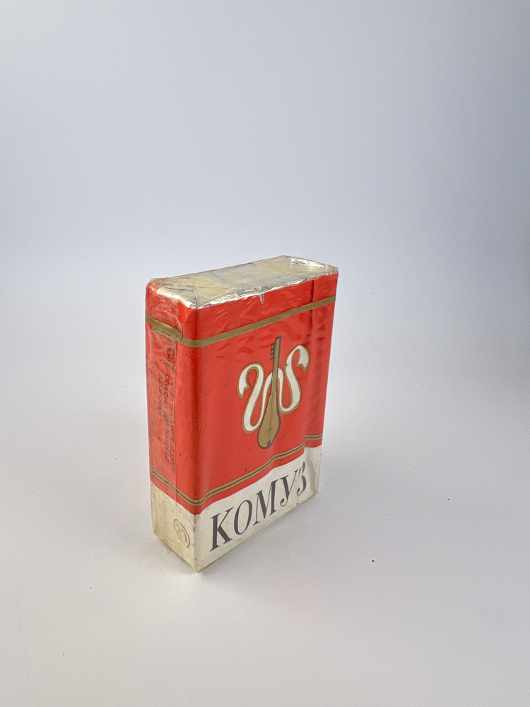 „Комуз“ – kirgizų kilmės cigarečių prekės ženklas, pavadintas pagal nacionalinį styginį instrumentą komuz, kuris pavaizduotas ir ant pakelio priekinės dalies. Ryškus raudonas fonas su baltu ir aukso apvadu bei minimalistiniu dizainu atspindi SSRS laikotarpio regioninius leidimus, skirtus parodyti respublikų kultūrinius simbolius. Užrašai atlikti kirilica, kairėje nurodytas gamintojas – Frunzės (dab. Biškeko) tabako fabrikas.