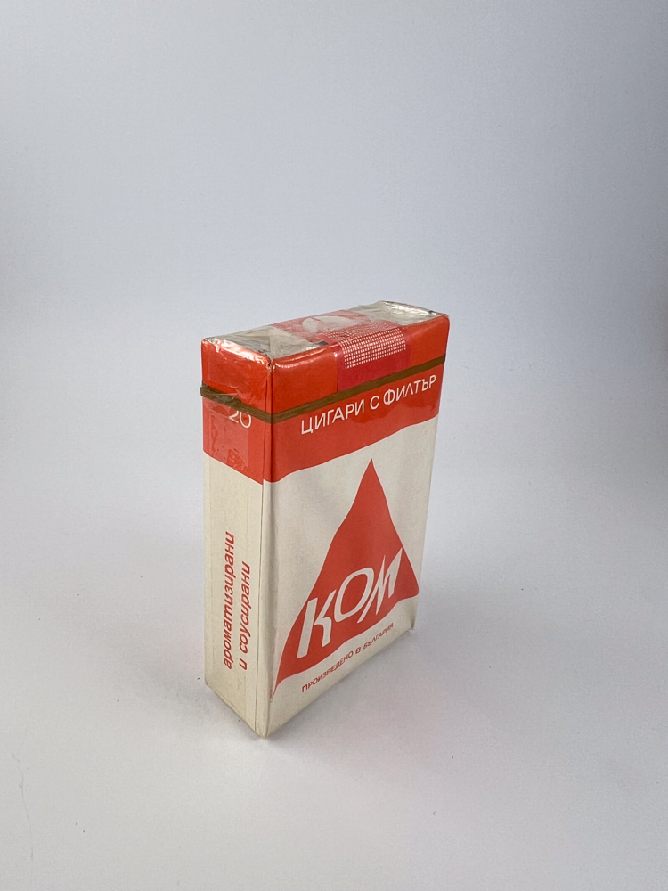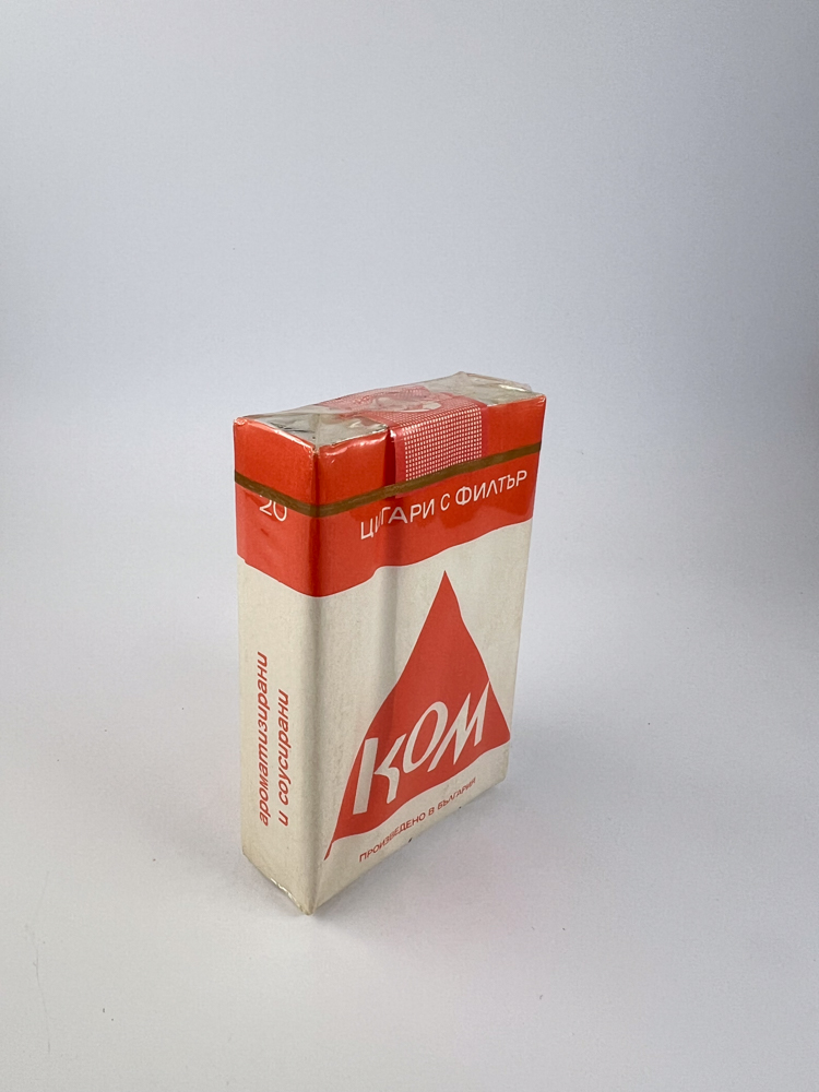 „"Com" (COM) – a classic Bulgarian cigarette brand named after Mount Kom (Kom vruh) – one of the highest peaks of the Balkan mountain range, symbolizing strength and endurance. Manufactured by Bulgarian state tobacco monopoly (Bulgarian State Tobacco Monopoly), and specifically – Sofia Tobacco Factory, which operated during the period when Bulgarian tobacco production was also exported to Eastern Europe.