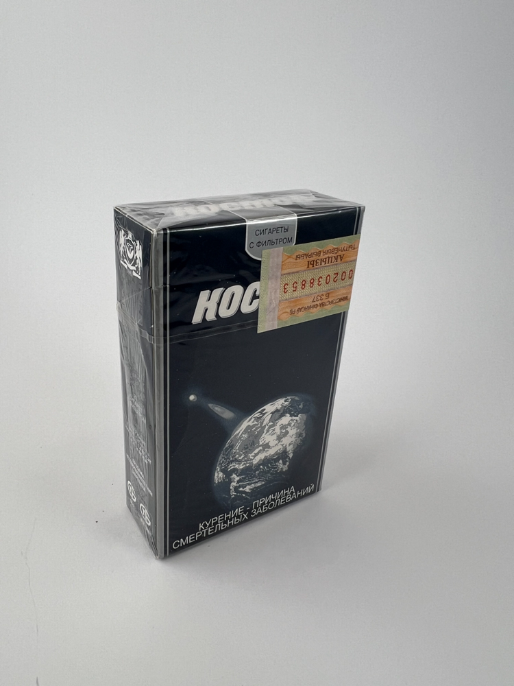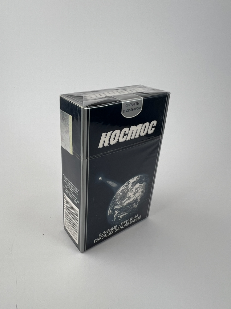 Description: This pack of „Kosmos“ cigarettes is one of the most famous examples of post-Soviet design. The pack, against a black background, depicts the planet Earth from space, with a beam of light shining above it. The top part reads „Сигареты с фильтром“ (Cigarettes with a filter) in Russian, and the bottom edge contains a health warning: „КУРЕНИЕ – ПРИЧИНА РАКОВЫХ ЗАБОЛЕВАНИЙ“ and „КУРЕНИЕ – ПРИЧИНА СМЕРТЕЛЬНЫХ ЗАБОЛЕВАНИЙ“ (lit. „Smoking is the cause of cancer/fatal diseases“). On the back, an authentic Russian excise stamp is visible, confirming its originality. The design is futuristic and cold, standing out among other products of its time.