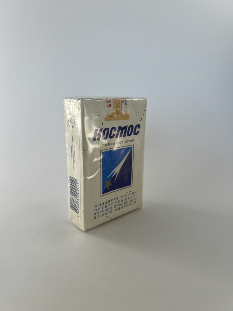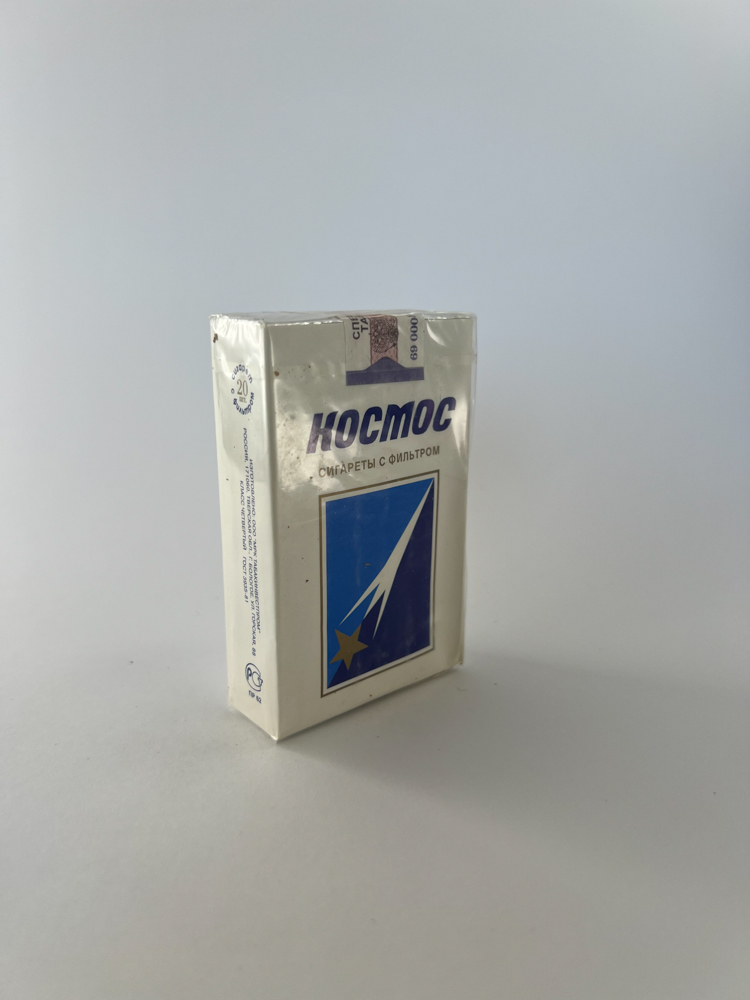 „The Kosmos cigarette pack is one of the most recognizable and iconic tobacco products from the former USSR, which continued into the Russian Federation. This particular edition features a white background, a dark blue logo, and a design of classic symbolism – a rocket rising with a star – symbolizing space power, technological progress, and nostalgic grandeur of the Soviet era.