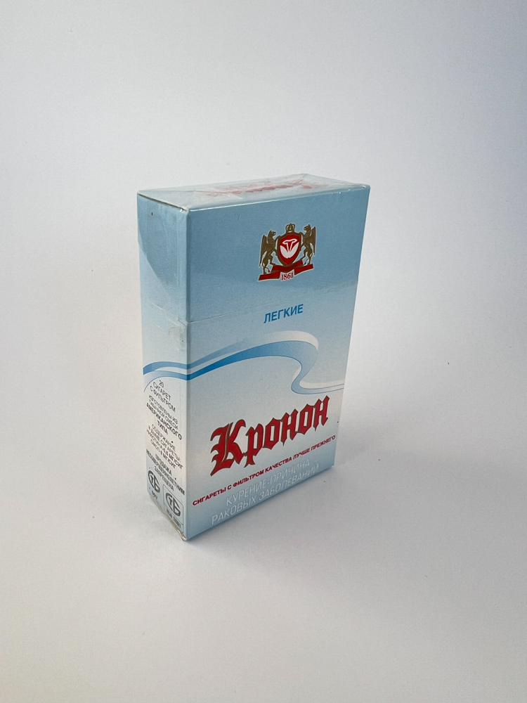 Šis „Кронон Лёгкие“ cigarečių pakelis pasižymi šviesiai mėlynu dizainu su baltais ir mėlynais grafikos elementais. Viršutinėje dalyje išryškintas herbas su ereliu ir inicialais, nurodančiais gamybos metus „1861“, greičiausiai tai siejasi su gamintojo istorija. Pavadinimas „Кронон“ raudona gotiška šrifto forma aiškiai išskiriamas pakuotės priekyje. Įrašo „Лёгкие“ (lengvos) pozicionavimas rodo švelnesnio skonio cigarečių variantą. Pakelis pažymėtas originalia Baltarusijos akcizine banderole. Apačioje – rusiškas įspėjimas apie rūkymo pavojų.