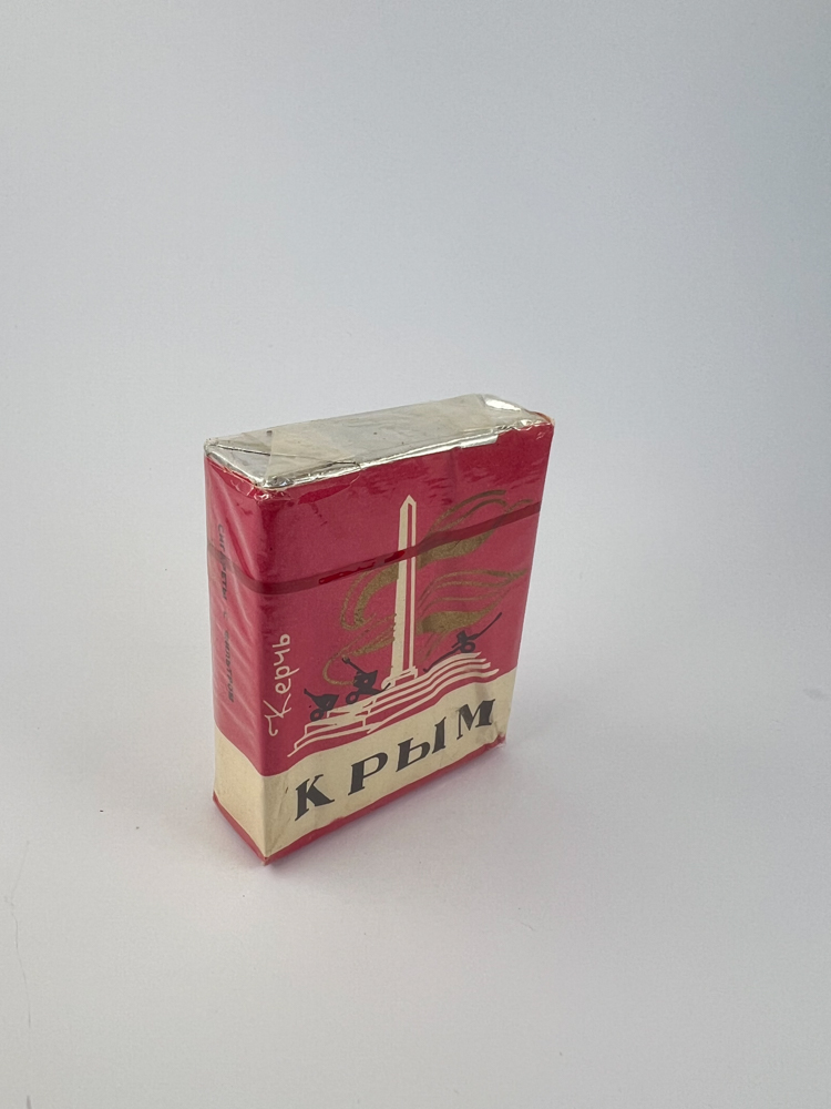 Description: This pack of „КРЫМ“ cigarettes belongs to the Crimea-themed series and is dedicated to the city of Kerch. The pack depicts a majestic monument with a motif of flags and stairs, symbolizing the historical significance and patriotic identity of the city. The pack is bright red, with a white lower segment, and the name „Керчь“ is written vertically on the left side of the pack. Visually, the pack stands out from other editions of the same series with its color scheme and composition.