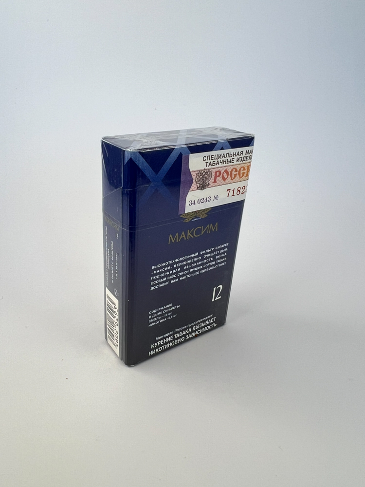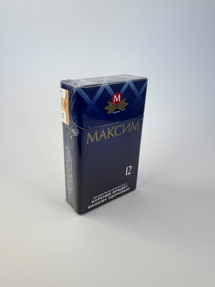 Description: „Максим 12“ yra rusiškos kilmės cigarečių pakelis, pasižymintis tamsiai mėlynu, beveik juodu fonu su stilizuotu „M“ logotipu ir auksinėmis detalėmis. Pakelis dekoruotas X formos ornamentais, išlaikant klasikinę ir solidžią estetiką. Šiame leidime nurodomas 12 mg dervų kiekis, o nugarinėje pusėje pateiktas gamintojo reklaminis tekstas apie skonio kokybę. Ant viršaus išlikusi originali akcizo juostelė su įrašu „РОССИЯ“ leidžia identifikuoti jo autentiškumą ir laikotarpį.