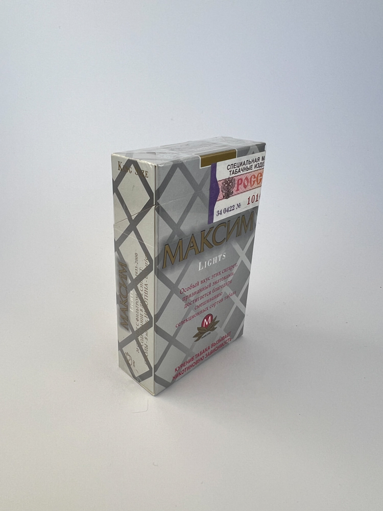 „"Максим Lights" is a light version of cigarettes produced in Russia, presented in an elegant gray-silver package with a geometric pattern. The upper part is dominated by the "M" logo with a laurel leaf motif, which enhances the brand's recognition. The back describes the special softness of the taste of these cigarettes, achieved thanks to specially selected tobacco varieties. The packaging is intact, with a Russian excise mark indicating official production.