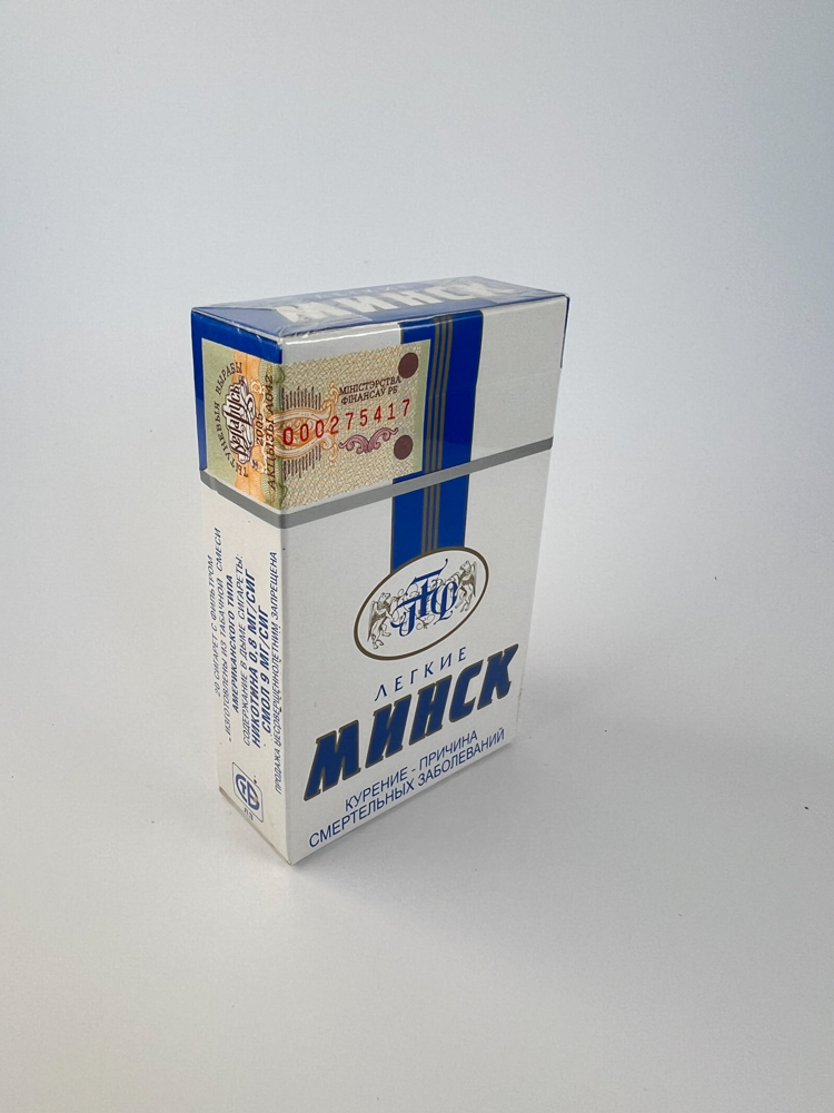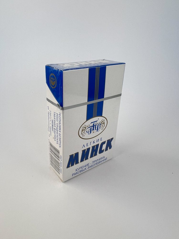 Description: „Минск Лёгкие“ cigarečių pakelis išlaikytas švaraus, minimalistinio dizaino – balta spalva su mėlynos ir sidabrinės spalvų vertikaliomis juostomis. Centre esantis herbas ir užrašas „Лёгкие“ (lengvos) nurodo rūšį, o prekės ženklas „Минск“ užrašytas ryškiomis mėlynomis raidėmis. Pakelio viršuje – originalus akcizo lipdukas iš Baltarusijos, su nuoroda į Finansų ministeriją. Šis pakelis atspindi standartinį ir santūrų dizainą, būdingą Baltarusijos vidaus rinkai.