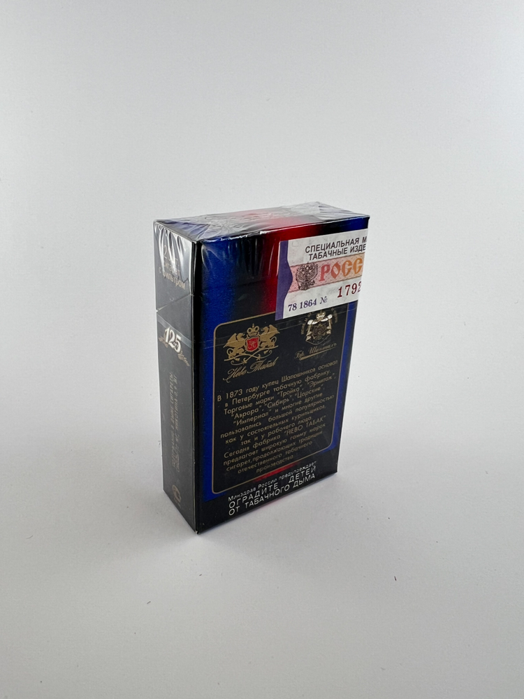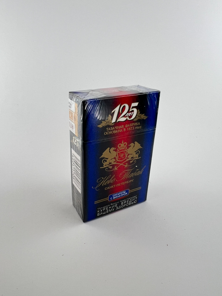 Šis Neva Tabak cigarečių pakelis yra išleistas ribotu tiražu, pažymint 125 metų nuo tabako fabriko įkūrimo Sankt Peterburge. Priekinėje pusėje dominuoja aukso spalvos logotipas su imperine simbolika ir užrašas „125 лет“, o pakelio fonas pereina nuo juodos iki sodriai mėlynos spalvos. Galinėje pusėje pateikta istorinė santrauka apie gamyklos įkūrimą ir veiklą nuo 1873 metų. Pakelis paženklintas oficialiu Rusijos akciziniu lipduku, įspėjimai apie rūkymo žalą nurodyti rusų kalba.