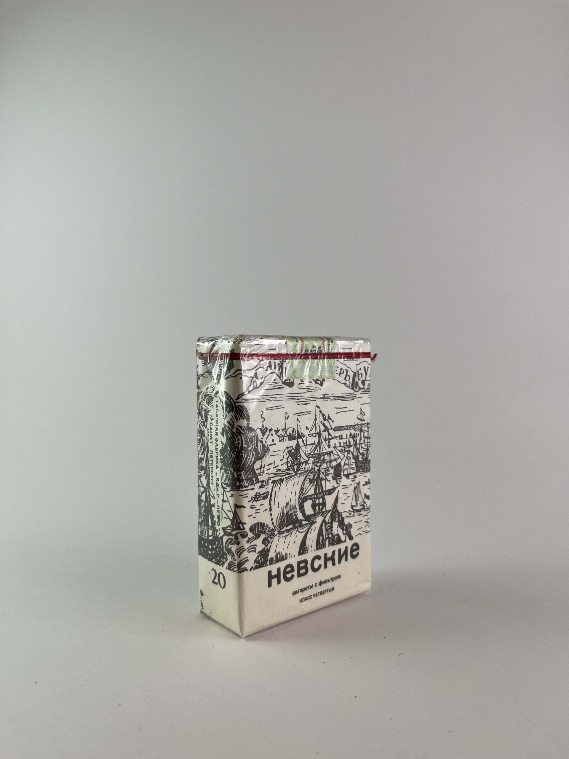 Description: This pack of cigarettes "Nevskie" stands out with its unique design, which depicts the theme of Russian ships and architecture. The combination of black and white colors with detailed graphics gives this pack cultural value. It is one of the classic cigarette brands of the Soviet era, popular among smokers and collectors.