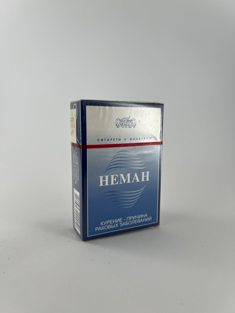 „The pack of "Neman" cigarettes is characterized by a combination of blue and silver colors with a classic aesthetic style of the Soviet period. The pack is marked with warnings about the harms of smoking in Russian, which is typical for products intended for export or the Russian market. At the top there is a clear indication of filtered cigarettes - "Сигареты с фильтром", and on one of the packs there is an authentic Russian excise stamp. Visually, the packaging is kept clean, symmetrical, reminiscent of the design style of post-Soviet industry.