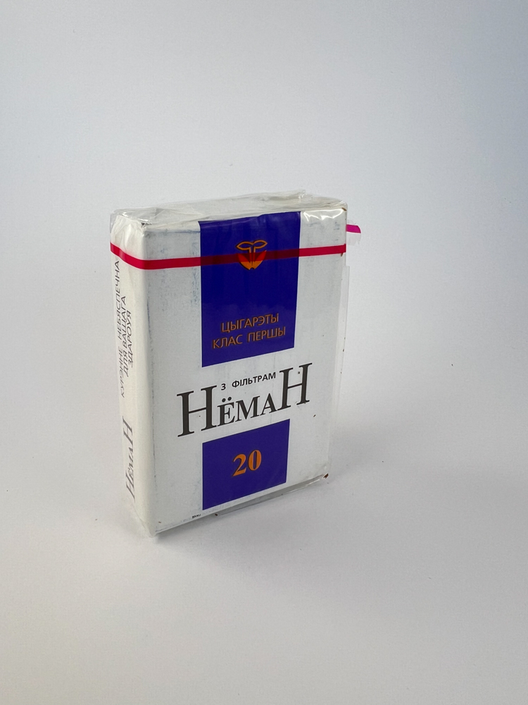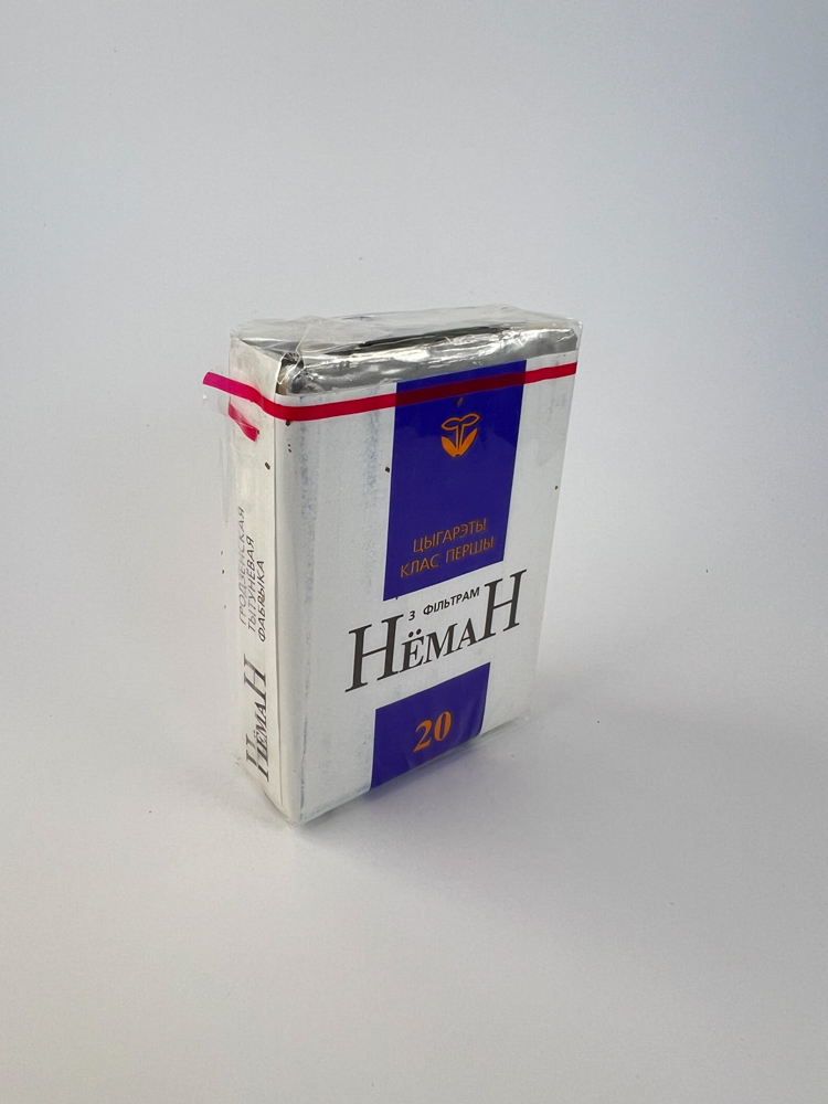 Šis „Нёман“ cigarečių pakelis išsiskiria tuo, kad visas tekstas pateiktas baltarusių kalba – tai retas atvejis šiuolaikinėje tabako produkcijoje. Pavadinimas „Нёман“ yra siejamas su žymia Baltarusijos upe. Pakelis baltas, dekoruotas violetiniais stačiakampiais ir raudona horizontaline juostele. Ant viršutinės dalies – gamintojo logotipas oranžinės ir violetinės spalvos derinyje. Pavadinimas „з фільтрам“ reiškia, kad cigaretės turi filtrą, o „клас першы“ pažymi pirmąją kokybės klasę.