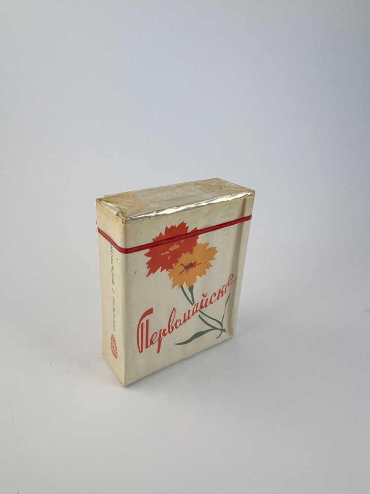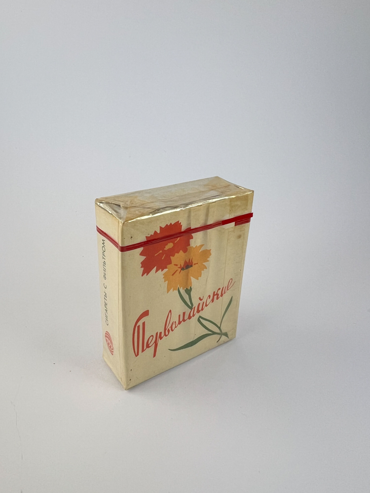 Description: „The pack of "Pervomaiskie" cigarettes is decorated with a floral motif - bright red and orange illustrations of carnation flowers, which are associated with the May 1st (Labor Day) holiday - one of the main in the Soviet Union. The red line running across the pack emphasizes the Soviet style, and the font style preserves the aesthetics of typography of the time. The cellophane has been preserved, the design is clean and classic.
