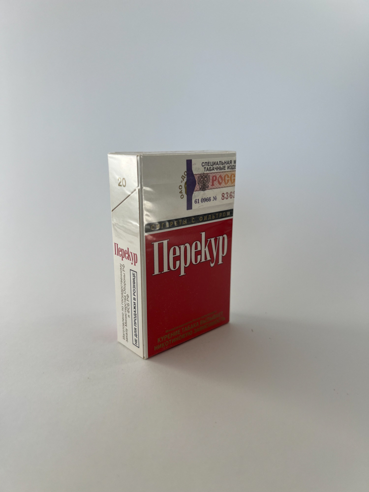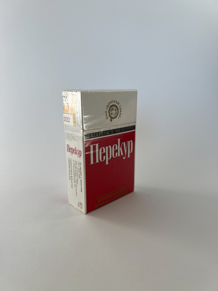„Перекур“ (liet. „Pertraukėlė rūkyti“) cigarečių pakelis – minimalistinio dizaino, dvispalvis: viršutinė dalis balta, apatinė – sodriai raudona. Dominuoja ryškus pavadinimas raudonai baltame fone. Pakelis pažymėtas OAO „Донской Табак“ ženklu – tai vienas didžiausių tabako gamintojų Rusijoje. Apačioje pateiktas įspėjimas apie rūkymo žalą, būdingas laikotarpiui iki vaizdinių įspėjimų įvedimo (iki 2008 m.). Pakelis nepažeistas, su oficialiu rusišku akcizo lipduku.