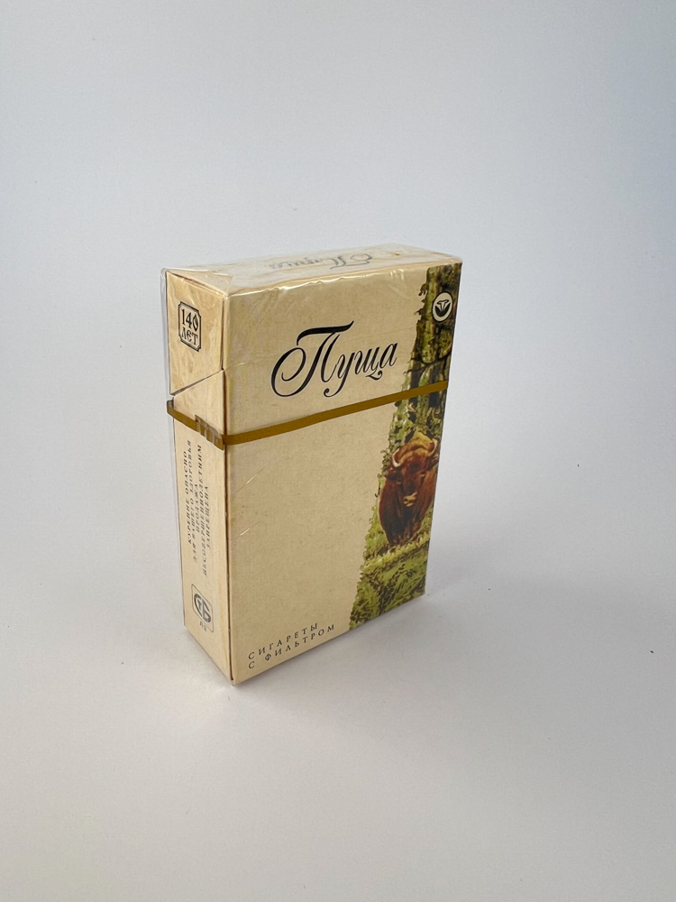 Description: Šis „Пуща“ cigarečių pakelis išsiskiria natūralistiniu dizainu – dominuoja žemės spalvos tonai, o priekinėje dalyje vaizduojamas stumbro atvaizdas, simbolizuojantis laukinę gamtą. Viršutinėje dalyje matomas tekstas „140 лет“, rodantis, jog tai yra jubiliejinis leidimas, skirtas minėti Tabako fabriko sukaktį. Pakelio šoninėse pusėse pateikta pagrindinė informacija apie gaminį, o priekinis užrašas nurodo, jog tai cigaretės su filtru. Dizainas perteikia santūrų, gamtai artimą įvaizdį, o pakelis išlaikytas puikios būklės su originalia pakuote.