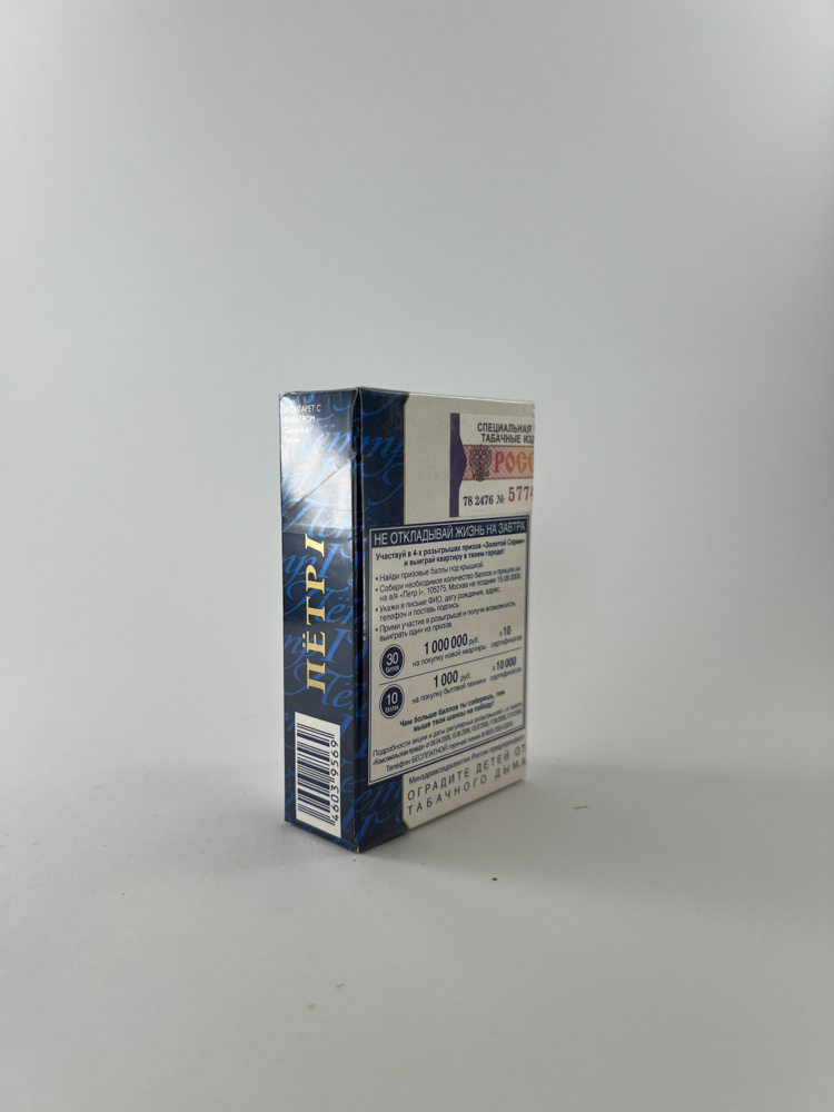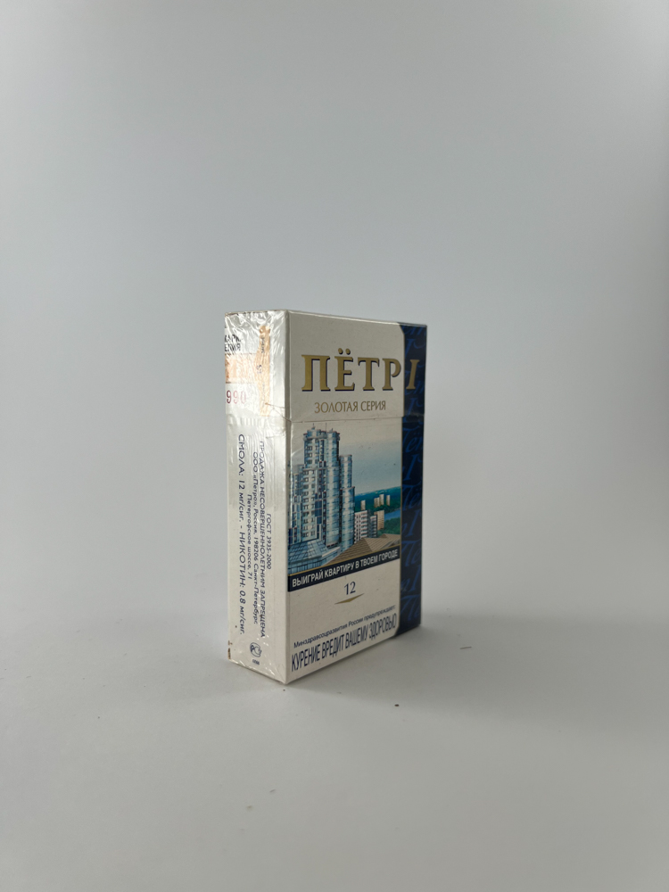 Description: „Пётр I Золотая Серия“ (lit. „Peter I – Golden Series“) is a limited edition cigarette pack, part of an advertising campaign that offered to win an apartment in your city. The package features an illustration of modern architecture and an invitation to participate in a lottery. The design combines gold fonts, a gray background, and a blue sidebar with the brand name. The back side contains detailed information about the prizes (up to 1 million rubles), which allows identifying this edition as one of the more interesting marketing projects on the Russian tobacco market in the mid-2000s.