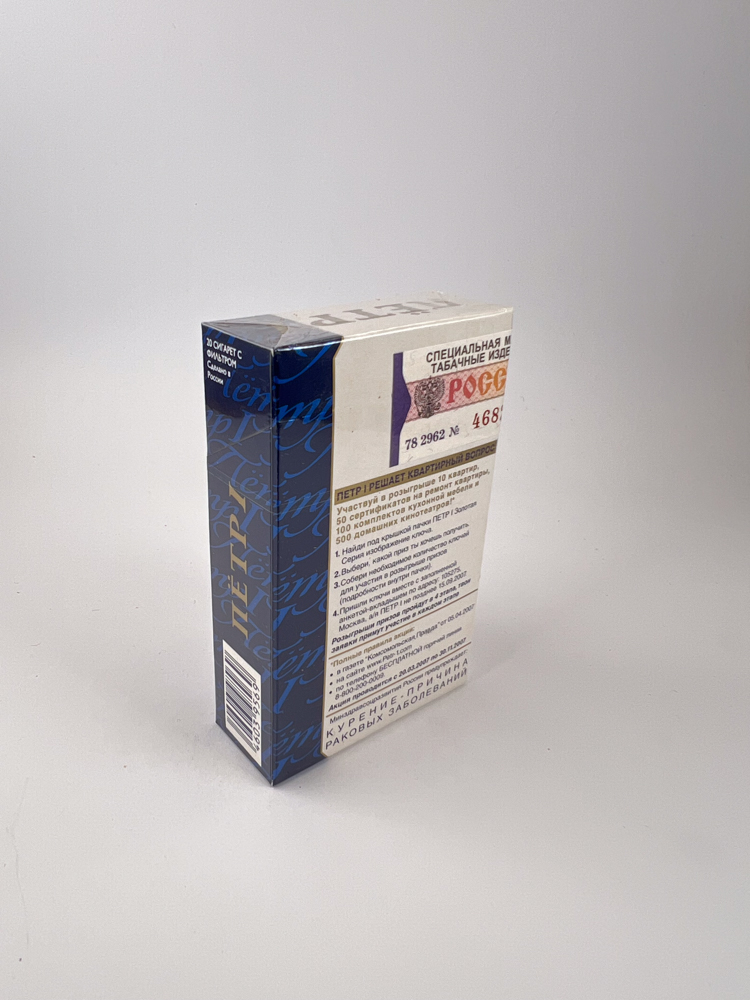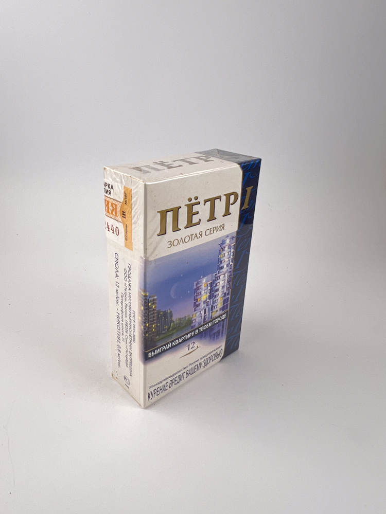 Dešinysis šonas mėlynas su pasikartojančiu užrašu Peter I, o kairėje – oranžinis akcizo lipdukas su verte 4.40 руб.