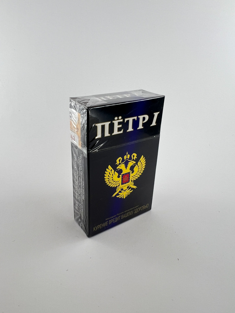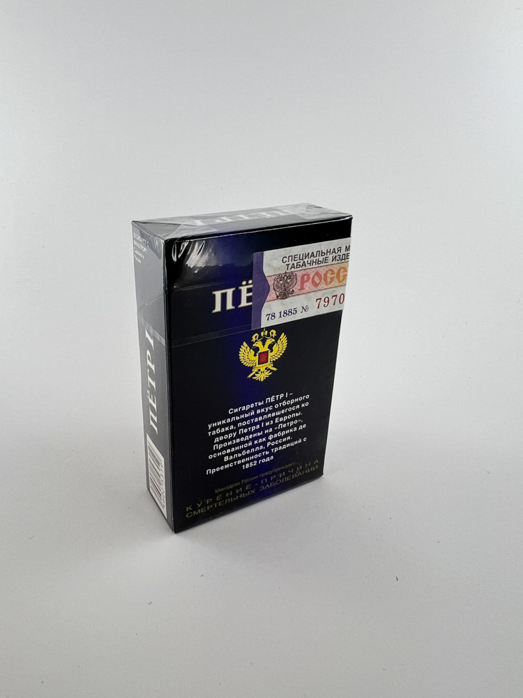 Historical data and popularity: „The Petr I brand was produced in Russia, emphasizing national history and prestige. The black design pack has become particularly recognizable on the market and is often mentioned in collector communities as one of the most desirable from this line. Its design stands out for its solidity and representativeness among other cigarettes on the Russian market.