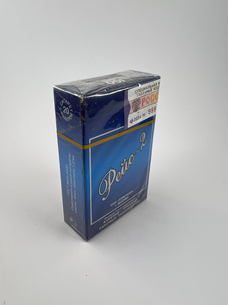„The "Рейс-2" cigarette pack is a Russian product released by the Moscow-based company "Эристоун". The pack is an intense blue color with a white and gold border, with a minimalist design that conveys a classic, clean visual style. The front background is dominated by the inscription "Рейс-2", and on the side are warnings about the harms of smoking. The appearance of this product reflects the aesthetics of Russian production of that period.