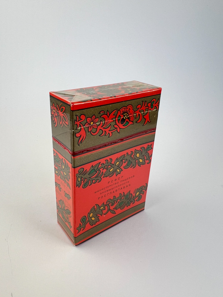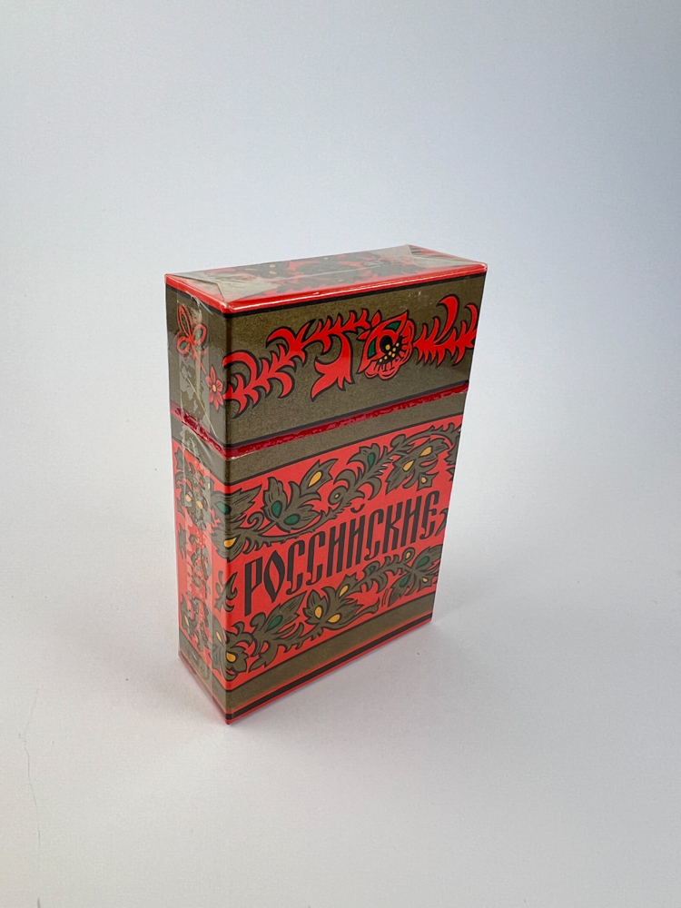 Description: Šis „Российские“ cigarečių pakelis atspindi sovietmečio liaudies meno įkvėptą dizainą – dekoruotas tradiciniais rusiškais ornamentais, su raudonų ir žalių augalinių motyvų juostomis ant auksinio fono. Pavadinimas „Российские“ reiškia „rusiškos“, ir jis išryškintas gotišku stiliumi centre. Viršutinė ir apatinė pakelio dalys dekoruotos gėlių juostomis, o galinėje pusėje nurodyta, kad cigaretės priklauso ROSGLAVTABAK – Sovietų laikų tabako pramonės struktūrai. Pakelio dizainas perteikia nacionalinį charakterį ir SSRS propagandinį vizualumą.