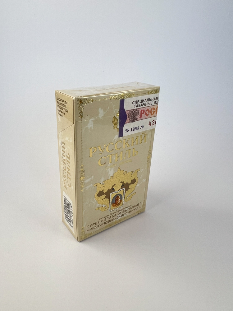 Description: „"Русский стиль" is a cigarette pack dominated by a light beige color with gold-colored inscriptions and decorative elements inspired by the style of Tsarist Russia. In the center is a golden double-headed eagle and a heraldic motif with an insert symbolizing the pursuit of exclusivity. The pack is in excellent condition with visible excise stripes and Russian warnings about the harm of smoking. The overall design conveys elegance and the stylistics of Russian traditions, which indicates positioning as a higher-class local product.