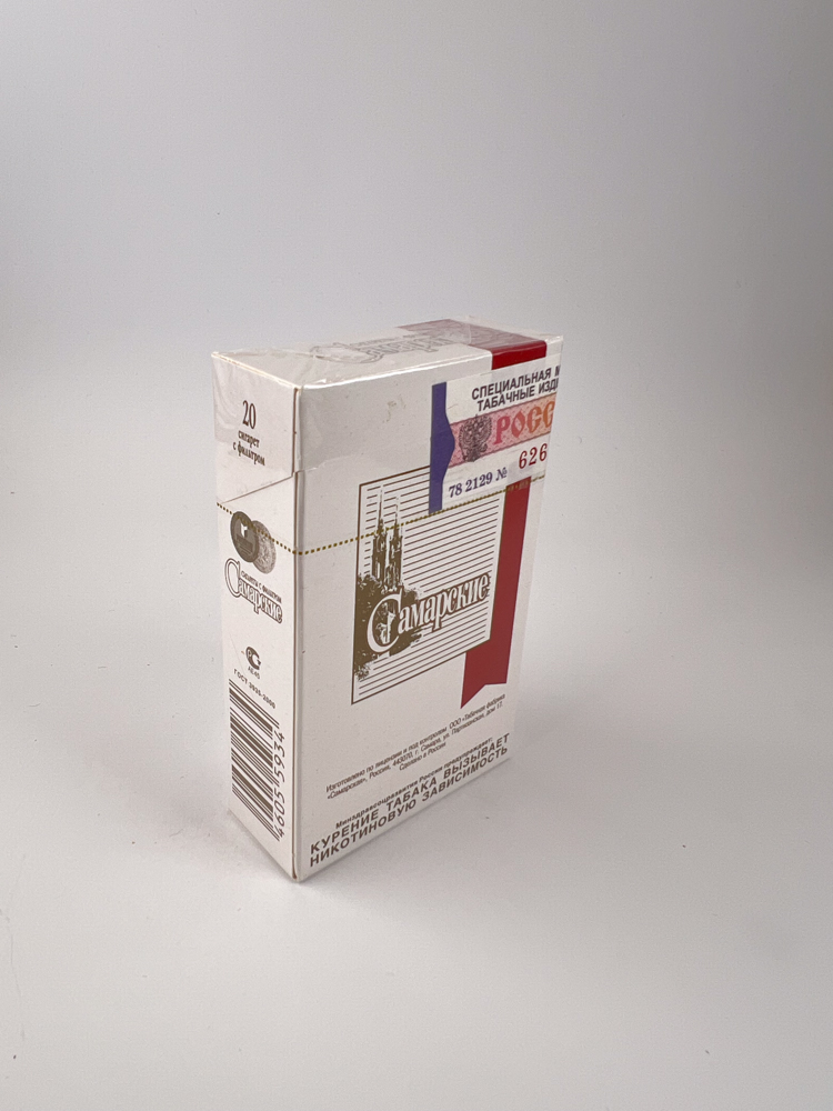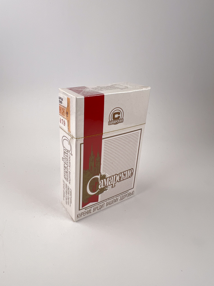 A cigarette pack with a classic Russian design, representing a locally produced product from the Samara region.