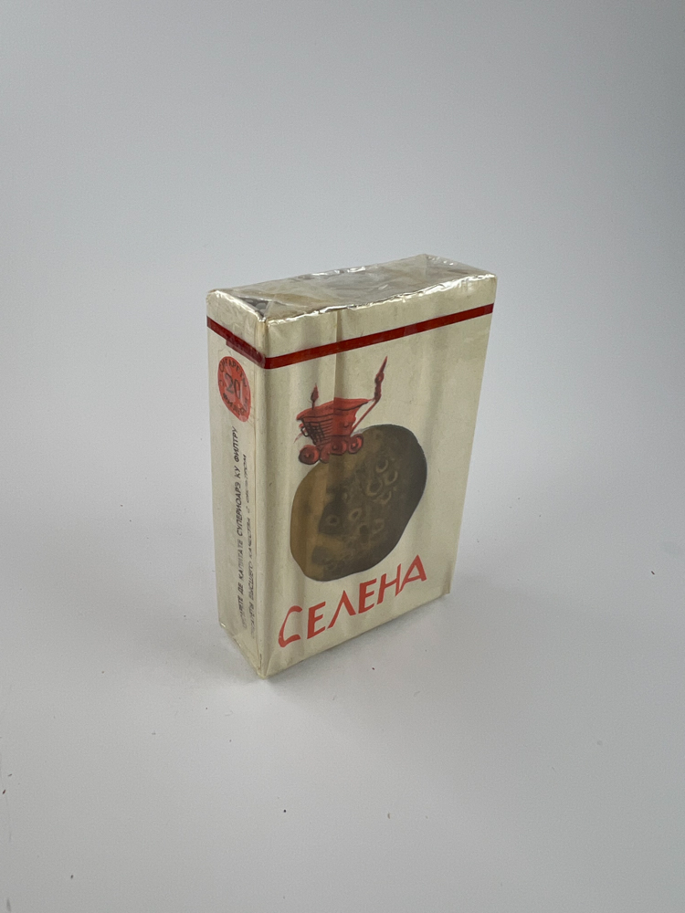 Šis „Селена“ cigarečių pakelis vaizduoja vieną iš labiausiai atpažįstamų sovietinės kosminės tematikos dizainų. Ant pakelio pavaizduotas raudonas mėnuleigis (Lunochod), važiuojantis Mėnulio paviršiumi, kas atspindi to meto SSRS kosmoso propagandos dvasią. Pakelio fonas baltas, akcentuotas raudonu užrašu „Селена“, viršuje – raudona horizontali juosta, klasikinė to laikotarpio stiliaus detalė. Tai išskirtinis ir teminis dizainas, labai patrauklus kolekcininkams, besidomintiems kosmine simbolika ar sovietine technologijų istorija.