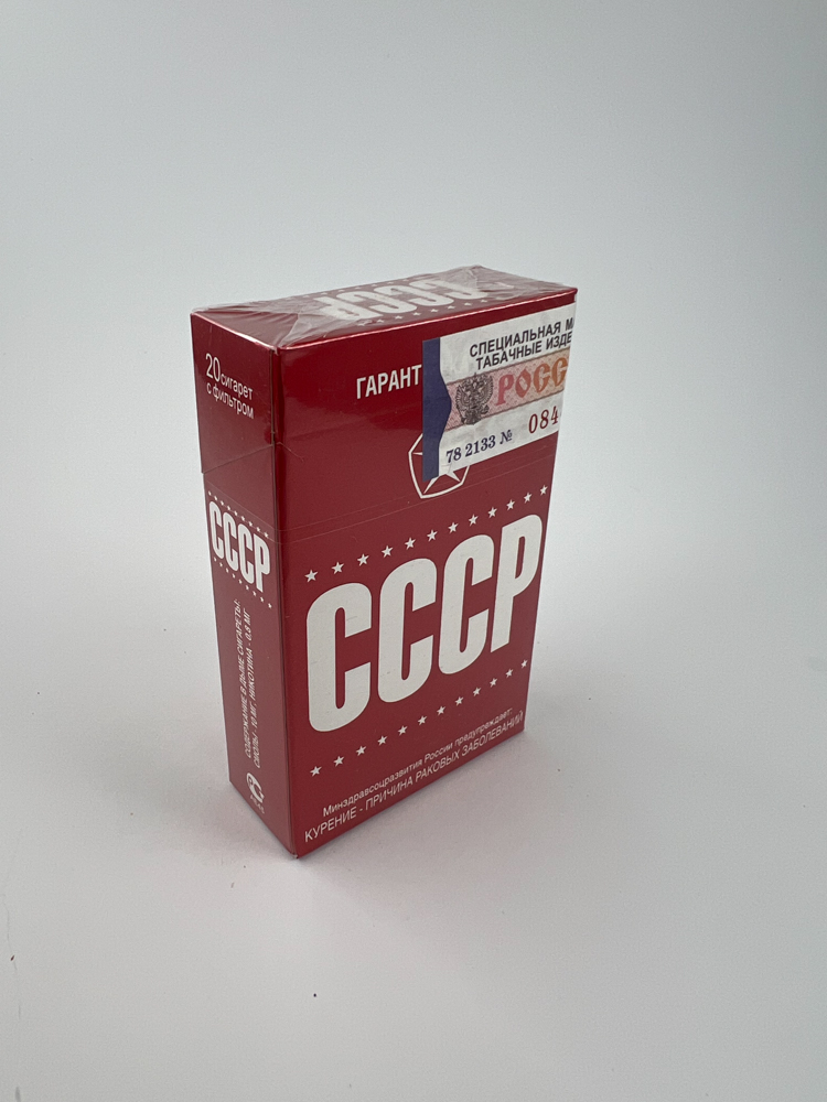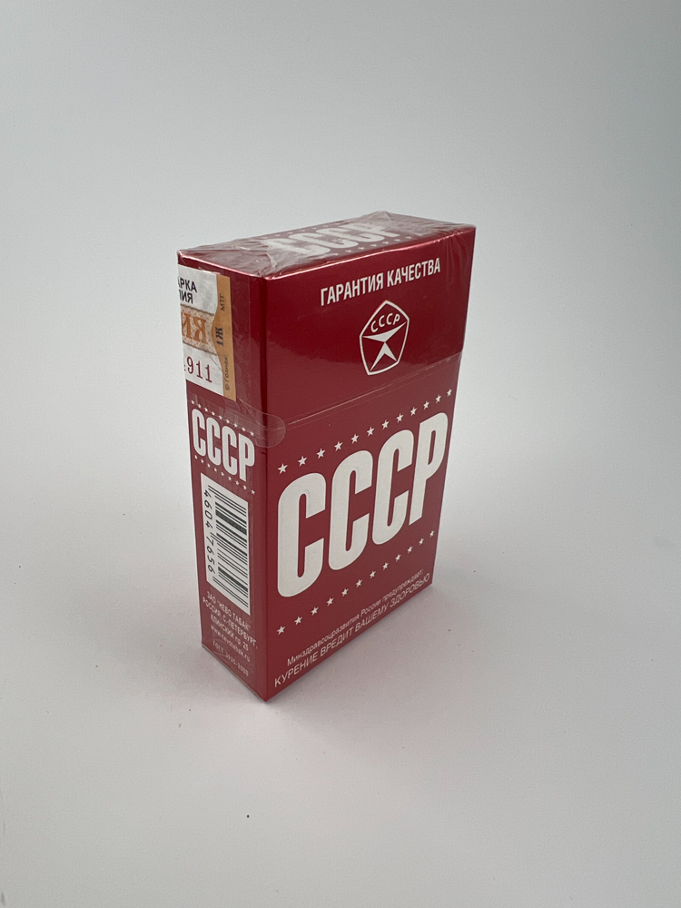 This cigarette pack marked "СССР" (lit. "TSSR") is a modern edition based on Soviet symbolism and style. The bright red background with white capital letters "СССР", a wreath of stars and the logo "ГАРАНТИЯ КАЧЕСТВА" conveys a retro and nostalgic aesthetic. The design of the pack directly plays with historical associations and is intended not only as a tobacco product, but also as a symbolic item for consumers sympathetic to the Soviet era.