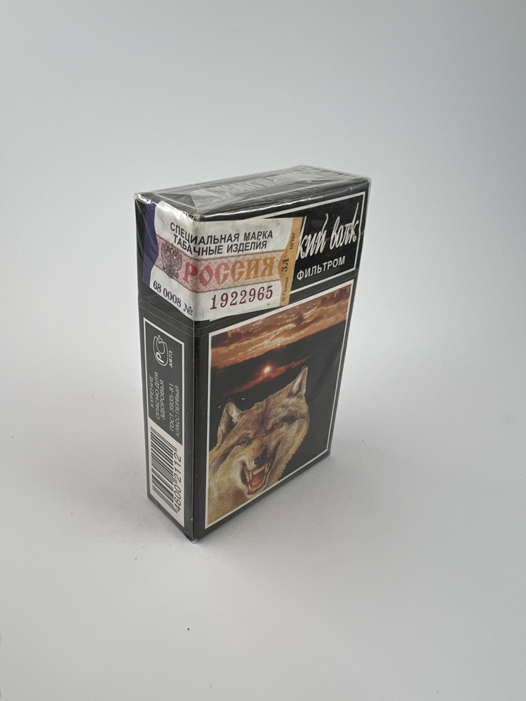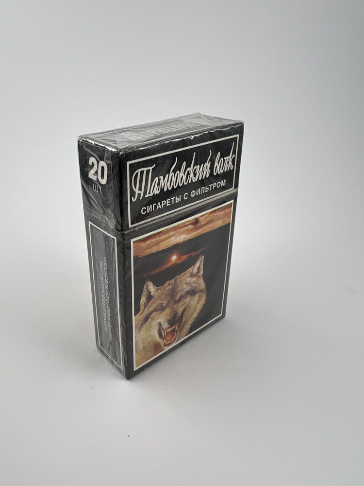 This pack of „Тамбовский волк“ cigarettes features a dark, predominantly black design with a white frame. In its center is an impressive image of a wolf, creating an aggressive and bright image. The name is written in a Gothic-style font at the top, and below it is the text „Сигареты с фильтром“ (with filter). On the other side are product information and codes, as well as a visible Russian excise sticker. This edition is associated with the Tambov region in Russia, whose folklore character – the „Tambov Wolf“ – has become a symbol of popular culture. The pack is undamaged, in its original film.