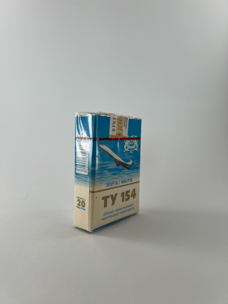This pack of cigarettes "ТУ 154" is named after the legendary Soviet passenger plane Tupolev TU-154, which was widely used in civil aviation from the 1970s to the 2000s. The design of the pack is distinguished by a bright blue background and a realistic depiction of a flying plane, while at the top there is a coat of arms and the date "1892", most likely indicating the year of the tobacco factory's foundation. The inscription "Сигареты с фильтром" indicates that these are filtered cigarettes. This model was intended for the domestic market, as evidenced by the Russian excise stamp and warnings.