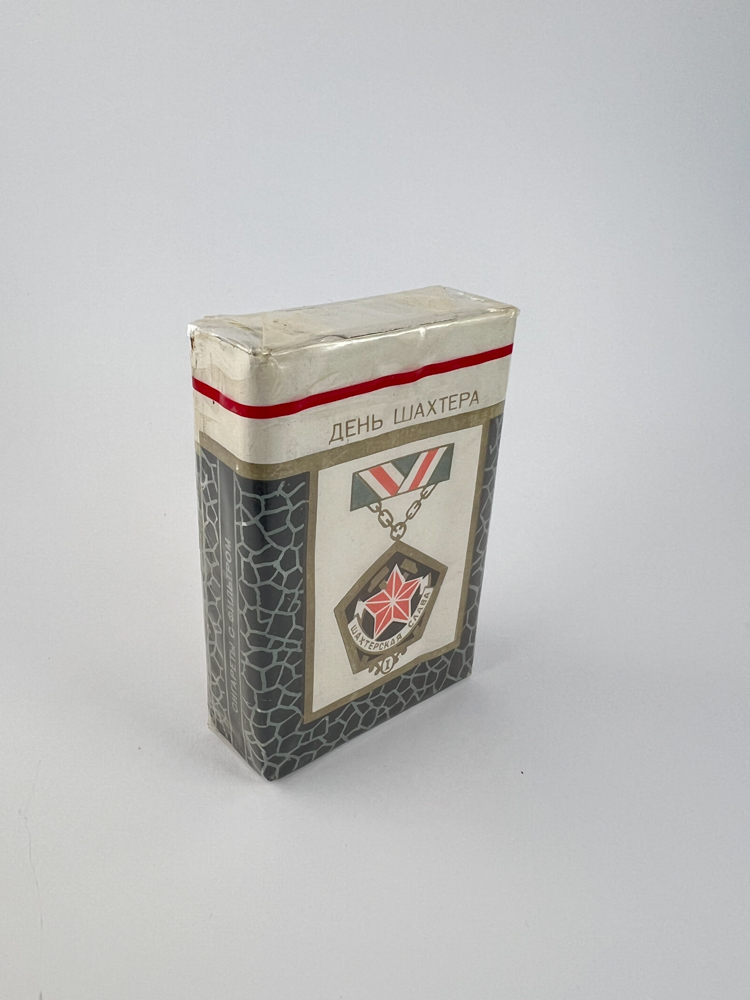 Description: This cigarette pack was released as a thematic edition on the occasion of "Miner's Day", which is clearly visible from the name and medal motif on the front side. The design retains a dark gray color scheme with a pattern resembling a stone texture - this symbolizes the coal mining industry. On the back side, the name "Уголёк" is displayed in a decorative frame. The pack retains design features from the Soviet era and is interesting to collectors due to its thematic nature and historical symbolism.