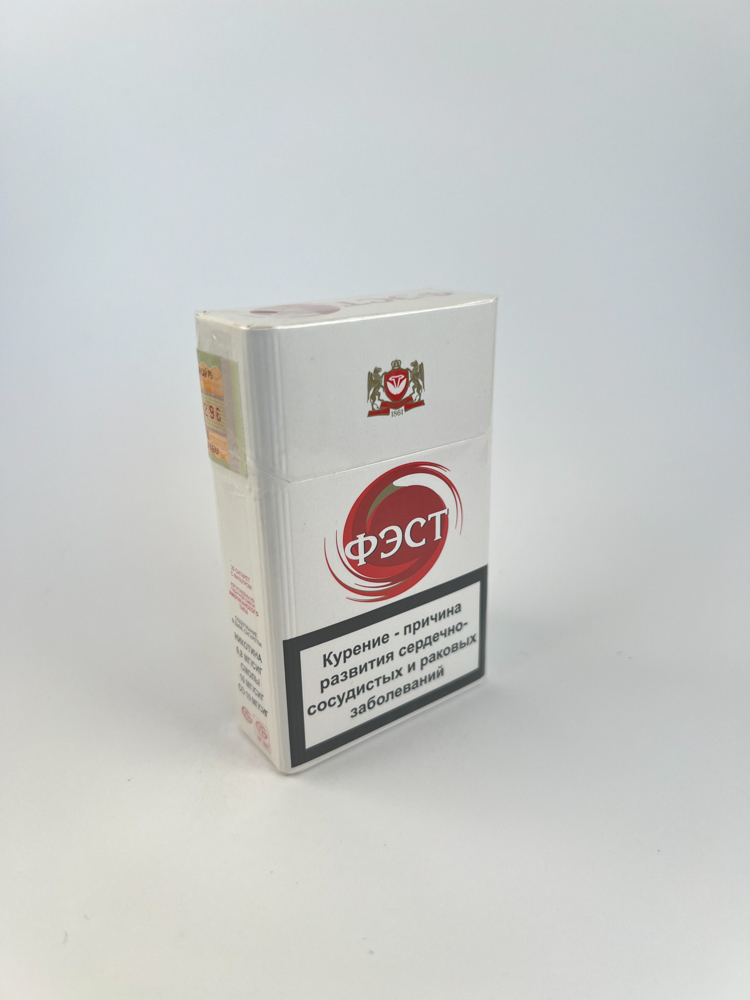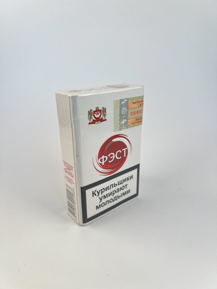 Description: „ФЭСТ“ – tai vienas populiariausių Baltarusijos cigarečių prekės ženklų. Šis pakelis pasižymi minimalistiniu, baltos spalvos dizainu su raudonu sūkuriu, kuriame įrašytas pavadinimas ФЭСТ (kirilička). Viršutinėje dalyje matomas valstybinis herbas su įkūrimo data „1861“, o apačioje – įspėjimai apie rūkymo žalą rusų kalba: „Rūkymas sukelia širdies ir kraujagyslių bei vėžinius susirgimus“ ir „Rūkaliai miršta jauni“. Ant pakelio taip pat aiškiai matomas Baltarusijos akcizo ženklas. Tai standartinis, vidaus rinkai skirtas pakelis.