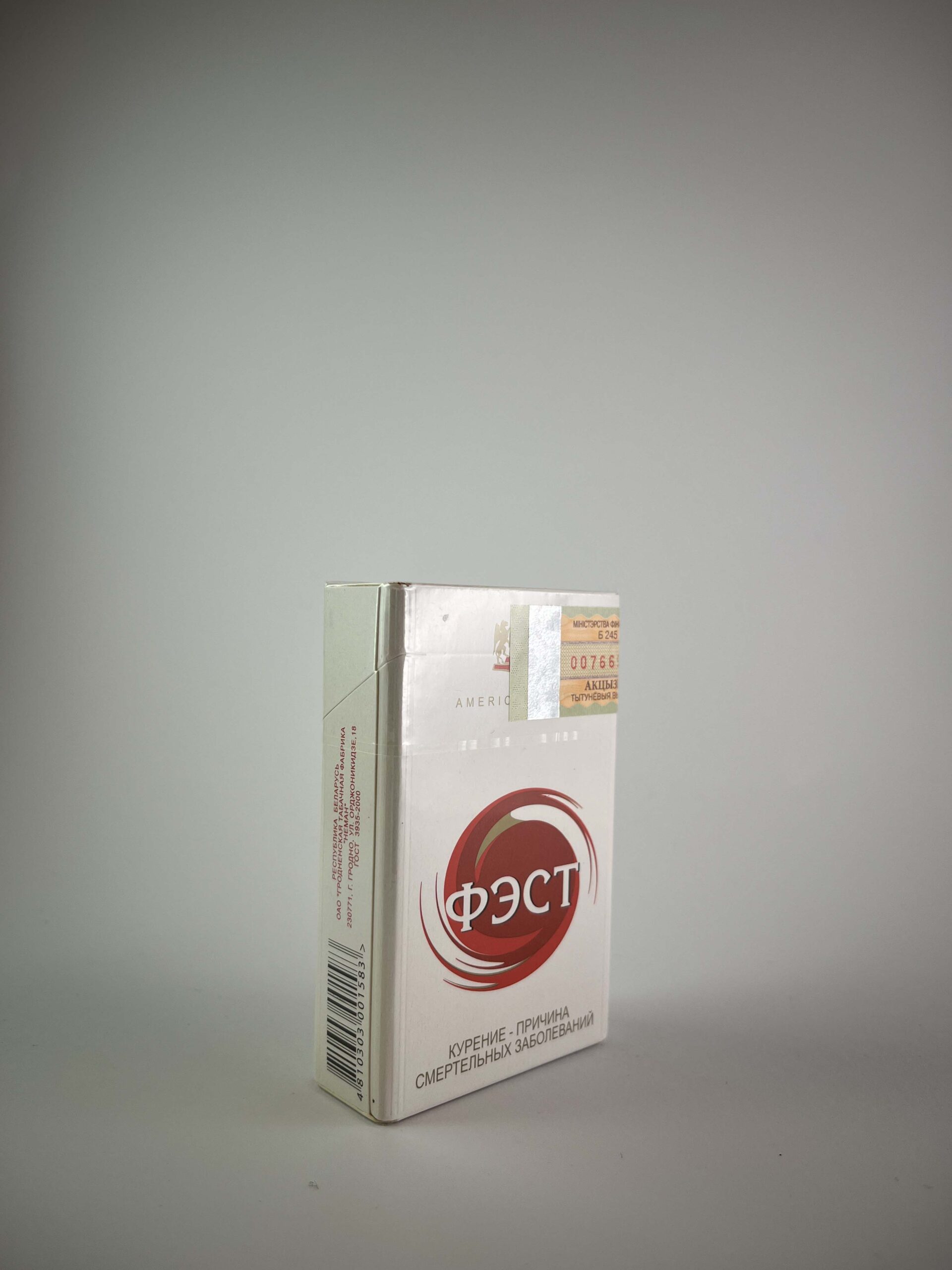 The cigarette pack is white with red and gold accents. The center is dominated by the „FEST” logo in a circle with gracefully curved lines. At the bottom is a health warning message in Russian, emphasizing the harm of smoking. The sides of the pack indicate technical data, the manufacturer and additional instructions. The excise sticker confirms that the pack is intended for the domestic market.