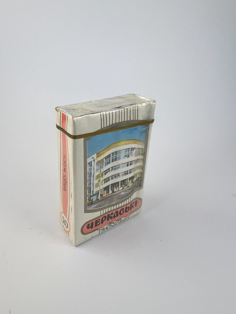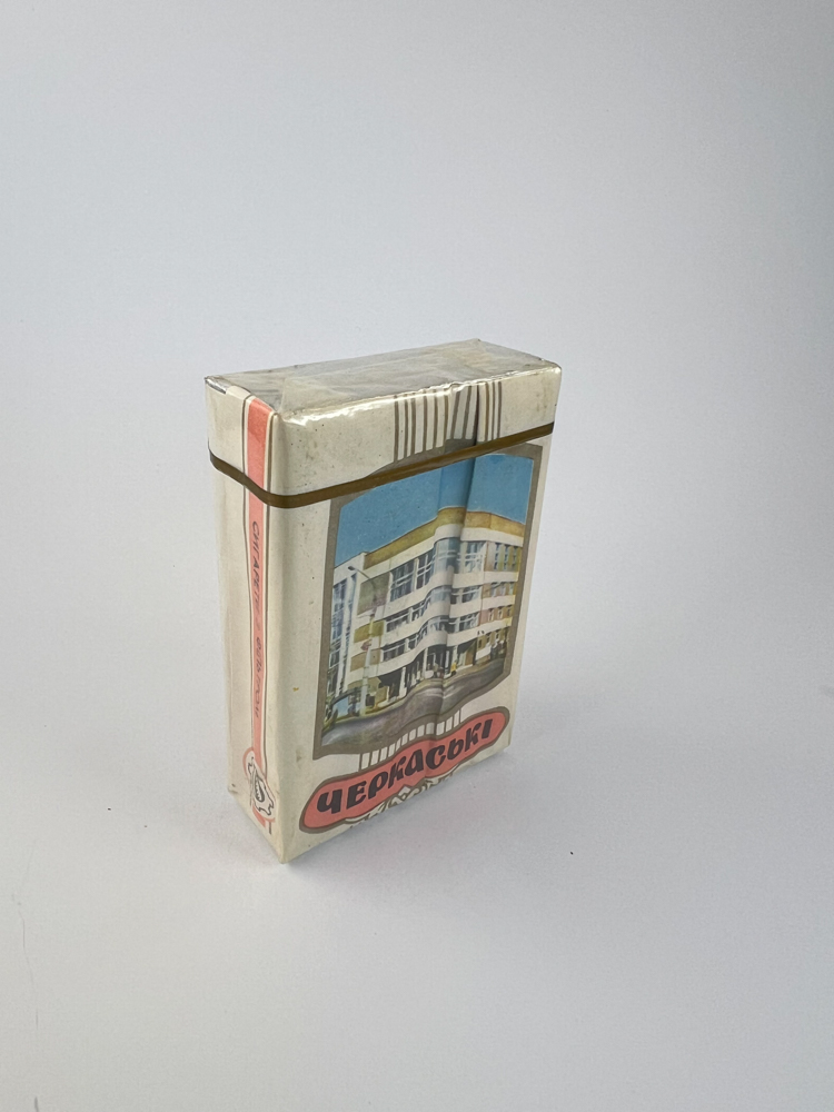 Description: This cigarette pack is an improved version of „Черкаські“, the name is supplemented with the tag „Вищої Якості“ – higher quality. The pack is distinguished by the architectural image of the building – a modern apartment building or hotel with a curved facade. The color scheme is light, dominated by white, pink and gold lines. This is a representative style edition, focused on the image of prestige and regional pride.