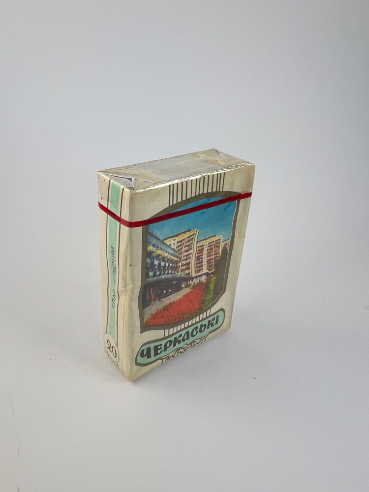 Historical data and popularity: Cigarette packs produced in the late USSR with images of cities or resorts were popular as a means of local identity. This edition depicts Cherkasy, an important city in central Ukraine.