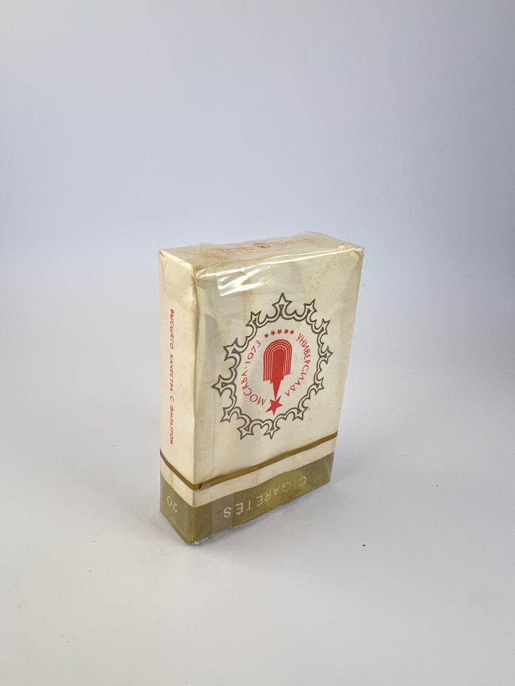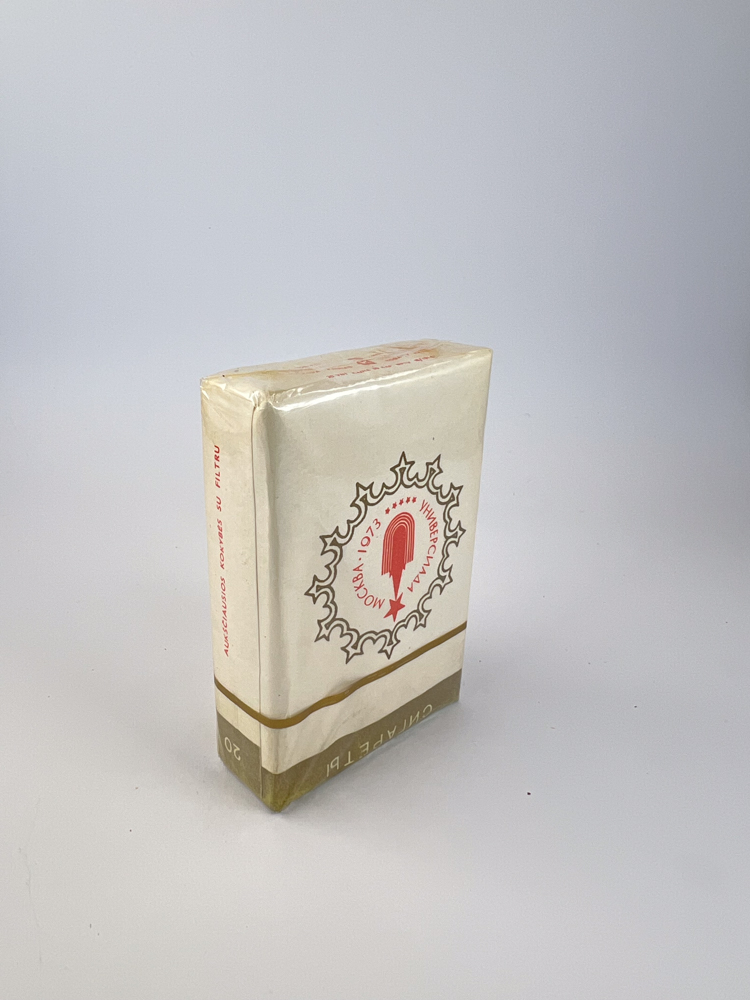 This Ява (Java) “Международный Конгресс 1973 Москва” pack stands out with its white-cream background with a minimalist design and a bright red symbol in the center, which shows a column with rays and five stars. A decorative ornament is surrounded by a border. In the lower part – a thin golden ribbon motif. The inscription “CIGARETTES” in English is visible on the lower edge. The handles / films (seals) are preserved – the pack has not been opened. Attention – this edition could have been created for commemorative conferences or congresses.