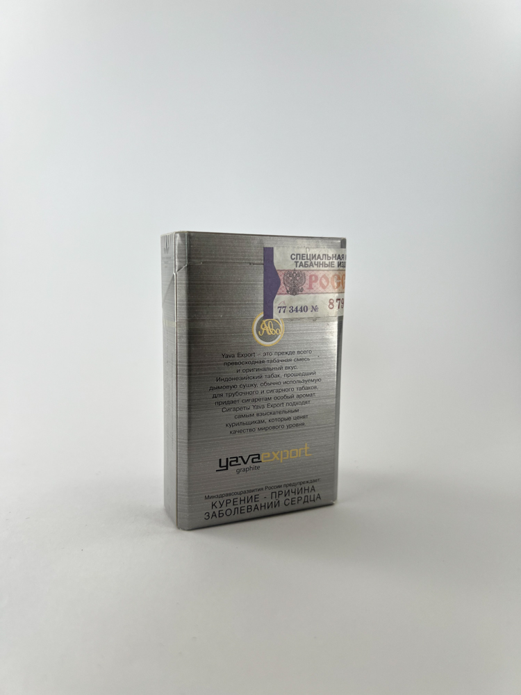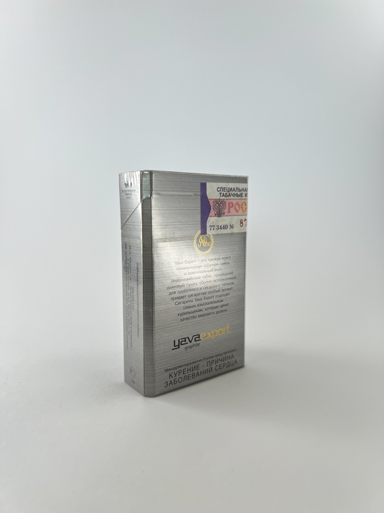 „Yava Export Graphite“ – tai vienas iš modernizuotų „Ява“ (Yava) linijos leidimų, sukurtų siekiant atnaujinti sovietmečio paveldo prekės ženklą. Pakelis dengtas metalizuotu, grafito efekto pagrindu, kurį papildo subtilūs auksiniai ir balti akcentai. Dizainas labai šiuolaikiškas, aiškiai orientuotas į tarptautines rinkas – pakuotėje akcentuojamas eksportinis lygis ir tabako kilmė (indonezietiškas tabakas). Tekste nurodyta, kad produktas atitinka „pasaulinės klasės kokybės“ standartus.