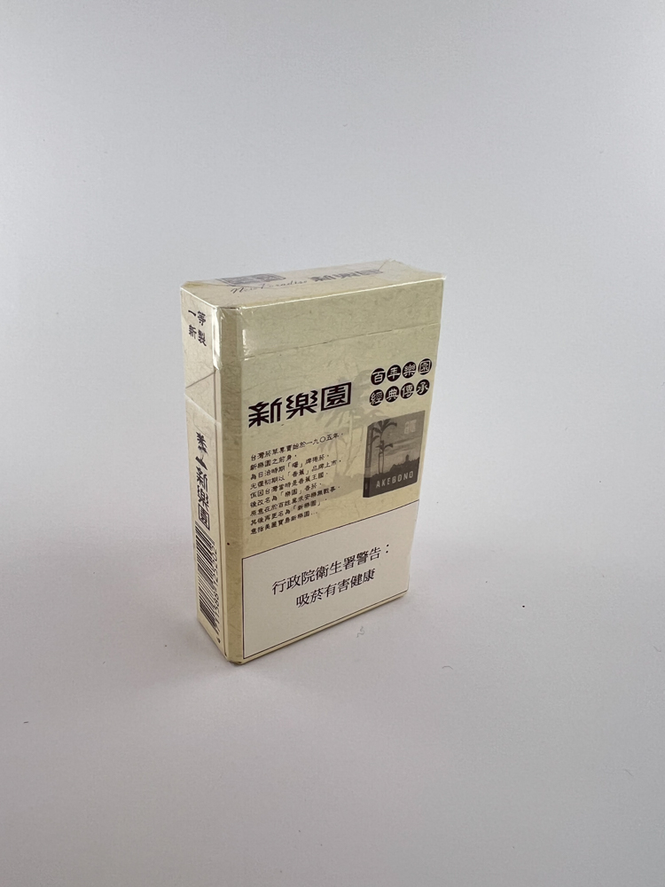 This New Paradise cigarette pack, also known by its Chinese name „新樂園“, features a nostalgic design with a subtle illustration of palm trees and mountains and a brown and cream background. Visually, it is a retro-style pack designed to pay homage to a historic brand, most likely a reproduction of an early 20th century design. The back of the pack contains information about „AKEDONO“, possibly the factory or original manufacturer. The health warning is in traditional Chinese, indicating that the pack is intended for the Taiwanese market.
