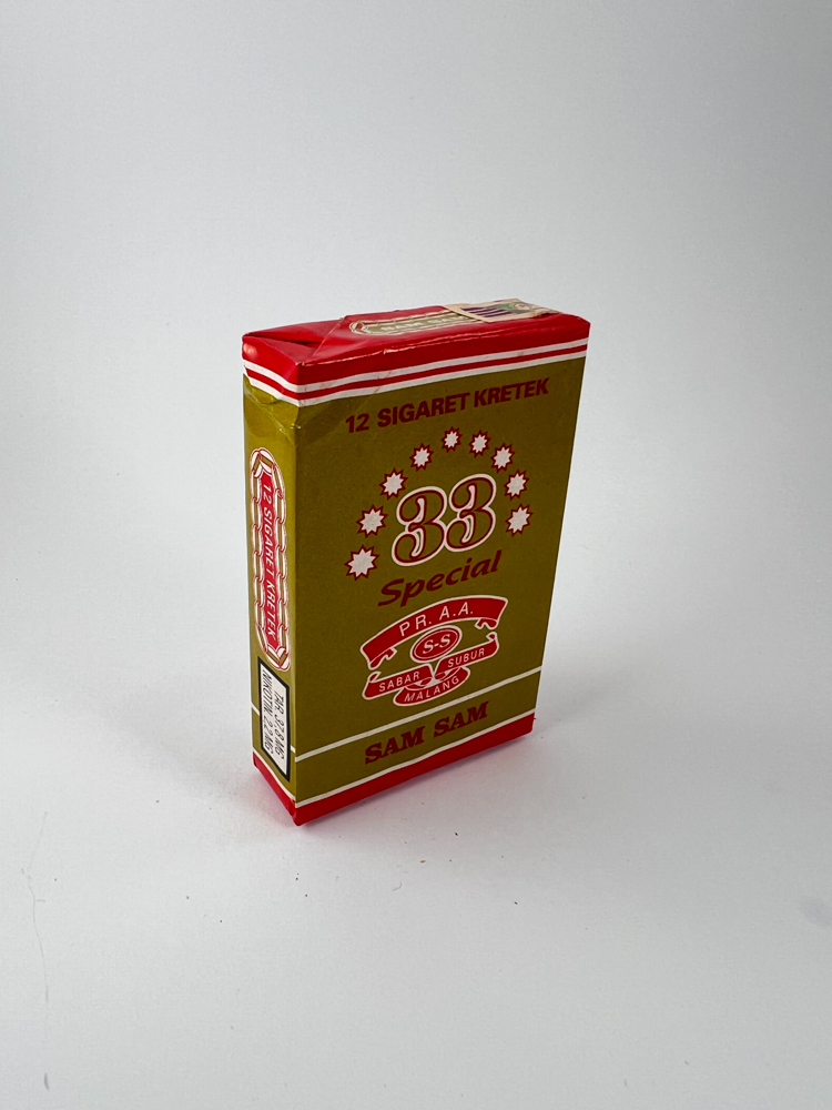 Description: 33 Special Sam Sam is a pack of kretek cigarettes from Indonesia, produced at the PRAA Sabar Subur factory in Malang. The pack is decorated in gold and red, with the name "33 Special" and the manufacturer's mark clearly displayed on the front. The inscription "Sam Sam" emphasizes the brand identity. The pack is in a smaller format - 12 cigarettes, which makes it rarer than regular releases. On the back is a description in Indonesian, which emphasizes the high-quality tobacco and clove composition. The pack has a health warning and the official Indonesian excise stamp.